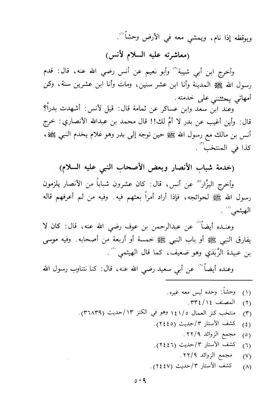 وأخرج البزّار عن أنس قال: كان عشرون شباباً من الأنصار يلزمون رسول الله صلى الله عليه وسلم لحوائجه، فإذا أراد أمراً بعثهم فيه. وفيه من لم أعرفهم قاله الهيمثي. وعنده أيضاً عن عبد الرحمن بن عوف رضي الله عنه قال: كان لا يفارق النبي صلى الله عليه وسلم أو باب النبي صلى الله عليه وسلم خمسة أو أربعة من أصحابه. وفيه موسى بن عبيدة الرَّبَذي وهو ضعيف، كما قال الهيثمي. وعنده أيضاً عن أبي سعيد رضي الله عنه قال: كنا نتناوب رسول الله