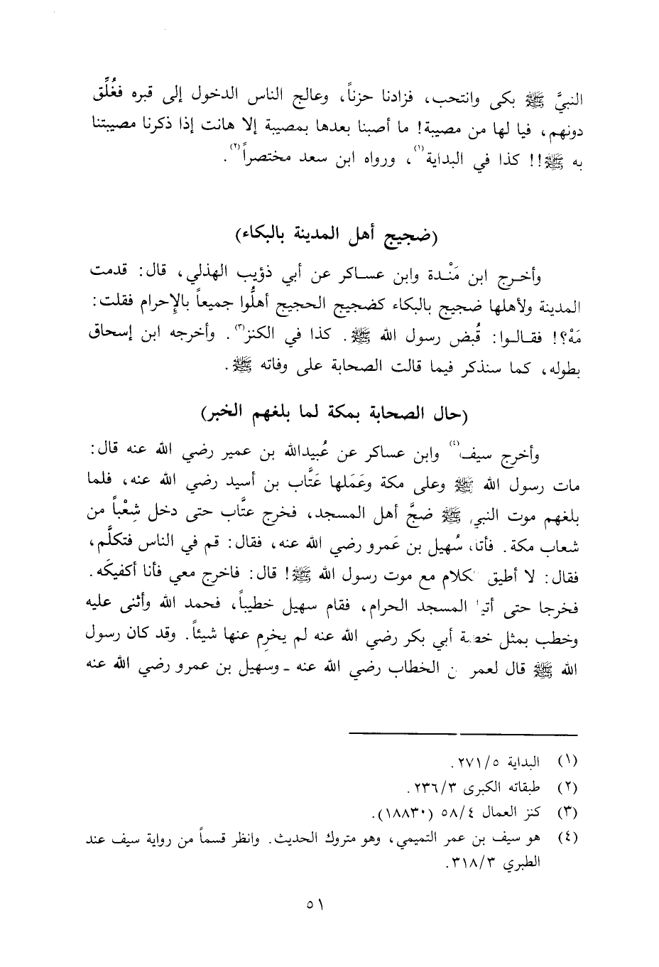 وأخرج ابن منده وابن عساكر عن أبي ذؤيب الهذلي قال: قدمت المدينة ولأهلها ضجيج بالبكاء كضجيج الحجيج أهلُّوا جميعاً بالإِحرام فقلت: مَهْ؟ فقالوا: قُبض رسول الله صلى الله عليه وسلم كذا في الكنزل. وأخرجه ابن إسحاق بطوله، كما سنذكر فيما قالت الصحابة على وفاته صلى الله عليه وسلم