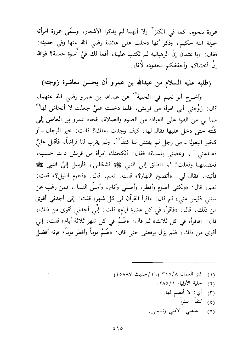وأخرجه أبو نعيم في الحلية عن عبد الله بن عمرو رضي الله عنهما قال: زوجني أبي امرأة من قريش، فلما دخلت عليَّ جعلت لا أنحاش لها مما بي من القوة على العبادة من الصوم والصلاة، فجاء عمرو بن العاص إلى كَنّته حتى دخل عليها فقال لها: كيف وجدت بعلك؟ قالت: خير الرجال - أو كخير البعولة - من رجل لم يفتش لنا كنفاً، ولم يقرب لنا فراشاً، فأقبل عليَّ فعذمني، وعضني بلسانه فقال: أنكحتك امرأة من قريش ذت حسب، فعضلتها وفعلت ثم انطلق إلى النبي صلى الله عليه وسلم فشاني، فأرسل إليَّ النبي صلى الله عليه وسلم فأتيته، فقال لي: «أتصوم النهار» ؟ قلت: نعم، قال: «فتقوم الليل» ؟ قلت: نعم، قال: «ولكني أصوم وأفطر، وأصلي وأنام، وأمسُّ النساء، فمن رغب عن سنتي فليس مني» ثم قال: «اقرأ القرأن في كل شهر» قلت: إني أجدني أقوى من ذلك، قال: «فاقرأه في كل عشرة أيام» قلت: إنِّي أجدني أقوى من ذلك، قال: «فاقرأه في كل ثلاث» ثم قال: صُمْ في كل شهر ثلاثة أيام» قلت: إني أقوى من ذلك، فلم يزل يرفعني حتى قال: «صُمْ يوماً وأفطر يوماً؛ فإنه أفضل