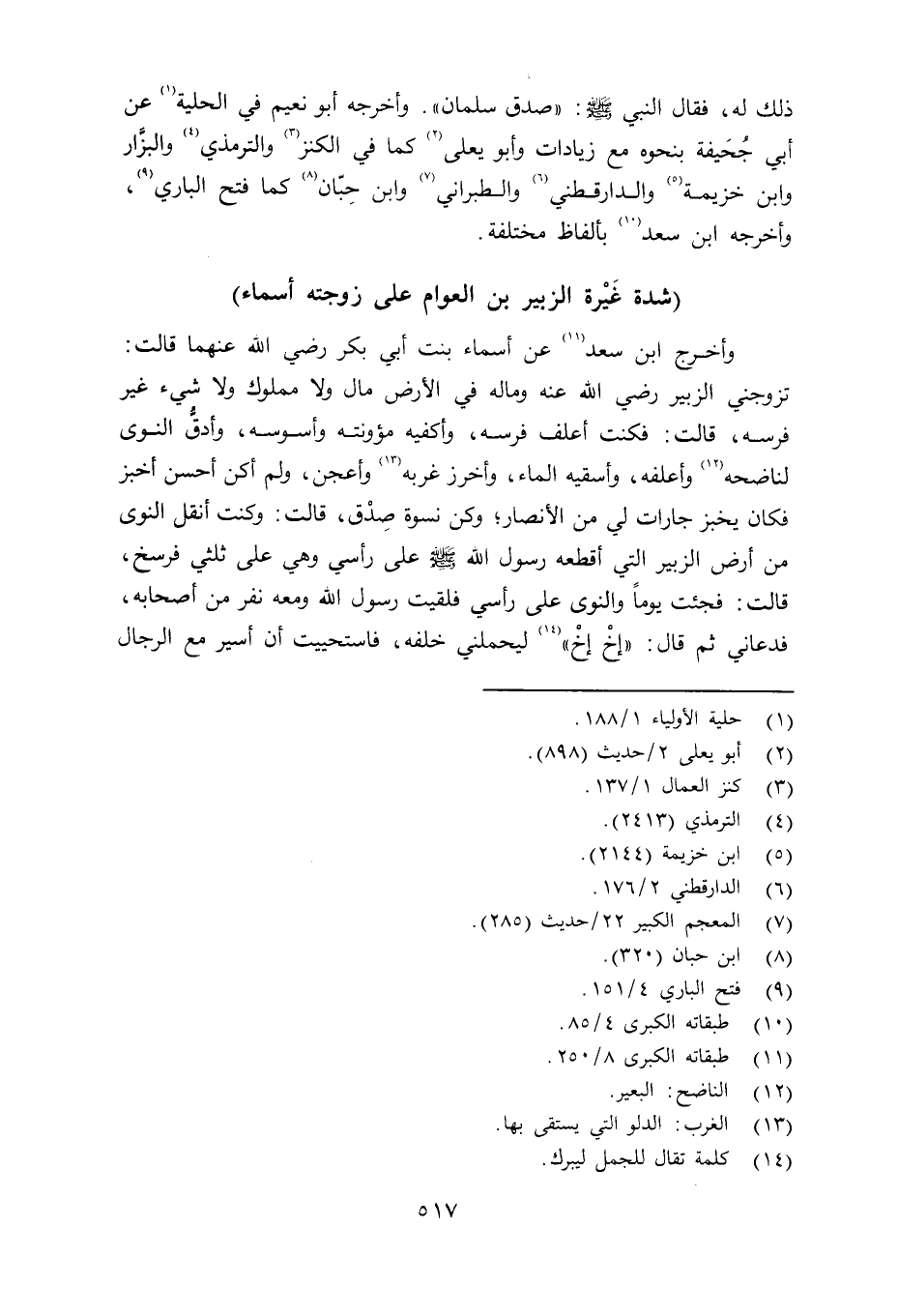 وأخرج ابن سعد عن أسماء بنت أبي بكر رضي الله عنهما قالت: تزوجني الزبير رضي الله عنه وما له في الأرض مال ولا مملوك ولا شيء غير فرسه، قالت: فكنت أعلف فرسه، وأكفيه مؤونته وأسوسه، وأدقُّ النوى لناضجح وأعلفه، وأسقيه الماء، وأخرز غربه وأعجن، ولم أكن أحسن أخبز فكان يخبز جارات لي من الأنصار؛ وكن نسوة صِدْق، قالت: وكنت أنقل النوى من أرض الزبير التي أقطعه رسول الله صلى الله عليه وسلم على رأسي وهي على ثلثي فرسخ، قالت: فجئت يوماً والنوى على رأسي فلقيت رسول الله ومعه نفر من أصحابه، فدعاني ثم قال: «إخْ إخْ» ليحملني خلفه، فاستحييت أن أسير مع الرجال