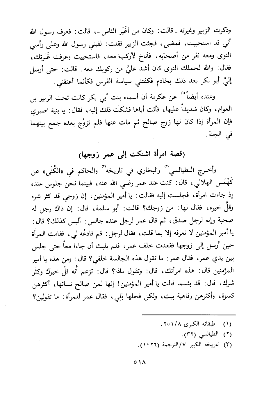 وذكرت الزبير وغَيرته - قالت: وكان من أغْيَر الناس -، قالت: فعرف رسول الله صلى الله عليه وسلم أني قد استحييت، فمضى، فجئت الزبير فقلت: لقيني رسول الله صلى الله عليه وسلم وعلى رأسي النوى ومعه نفر من أصحابه، فأناخ لأركب معه، فاستحييت وعرفت غَيْرتك، فقال: والله لحملك النوى كان أشد عليَّ من ركوبك معه. قالت: حتى أرسل إليَّ أبو بكر بعد ذلك بخادم فكفتني سياسة الفرس فكأنما أعتقني. وعنده أيضاً عن عكرمة أن أمساء بنت أبي بكر كانت تحت الزبير بن العوام، وكان شديداً عليها، فأتت أباها فشكت ذلك إليه، فقال: يا بنية اصبري فإن المرأة إذا كان لها زوج صالح ثم مات عنها فلم تزوَّج بعده جمع بينهما في الجنة.