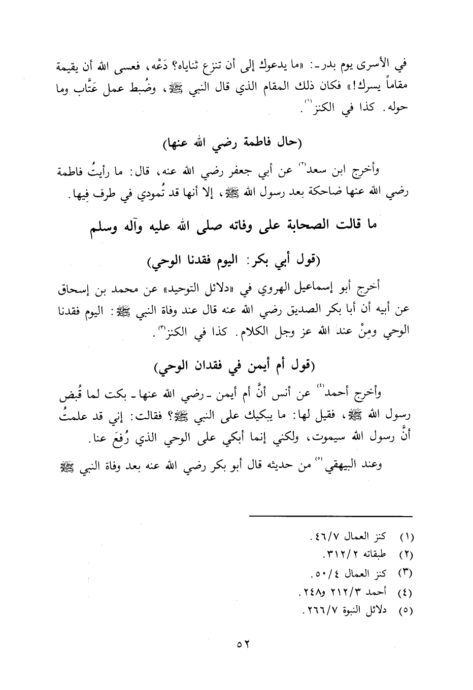 وأخرج أحمد عن أنس أنَّ أم أيمن - رضي الله عنها -بكت لما قُبض رسول الله صلى الله عليه وسلم فقيل لها: ما يبكيك على النبي صلى الله عليه وسلم فقالت: إني قد علمتُ أنَّ رسول الله سيموت، ولكني إنما أبكي على الوحي الذي رفع عنا.