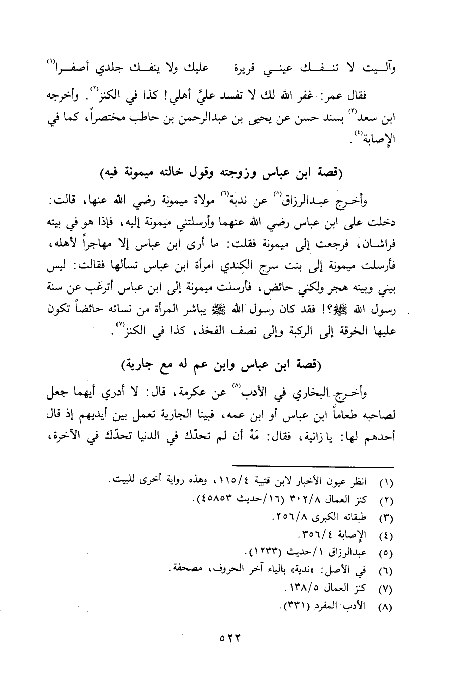 وأخرج عبد الرزاق عن ندبة مولاة ميمونة رضي الله عنها قالت: دخلت على بن عباس رضي الله عنهما وأرسلتني ميمونة إليه، فإذا هو في بيته فراشان، فرجعت إلى ميمونة فقلت: ما أرى ابن عباس إلا مهاجراً لأهله، فأرسلت ميمونة بنت سرج الكِندي امرأة ابن عباس تسألها فقالت: ليس بيني وبينه هجر ولكني حائض، فأرسلت ميمونة إلى ابن عباس أترغب عن سنة رسول الله صلى الله عليه وسلم فقد كان رسول الله صلى الله عليه وسلم يباشر المرأة من نسائه حائضاً تكون عليها الخرقة إلى الركبة وإلى نصف الفخذ، كذا في الكنز.