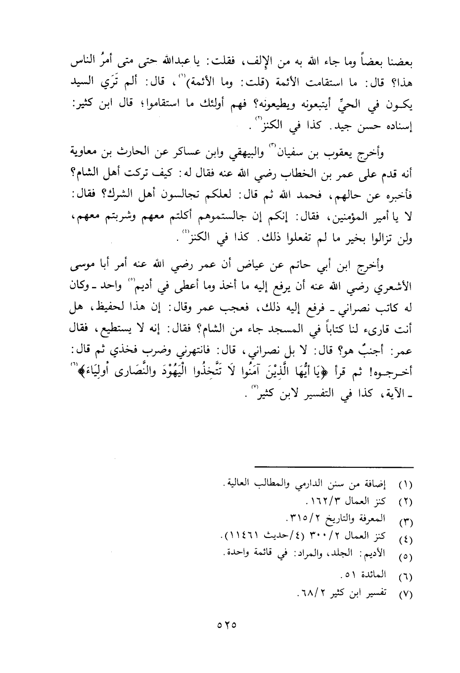 تابع وأخرج يعقوب بن سفيان والبيهقي وابن عساكر عن الحارث بن معاوية أنه قدم على عمر بنالخطاب رضي الله عنه فقال له: كيف تركت أهل الشام؟ فأخبره عن حالهم، فحمد الله ثم قال: لعلكم تجالسون أهل الشرك؟ فقال: لا يا أمير المؤمنين، فقال: إنكم إن جالستموهم أكلتم معهم وشربتم معهم، ولن تزالوا بخير ما لم تفعلوا ذكل. كذا في الكنز الكنز. وأخرج ابن أبي حاتم عن عياض أن عمر رضي الله عنه أمر أبا موسى الأشعري رضي الله عنه أن يرفع إليه ما أخذ وما أعطى في أديم واحد - وكان له كتاب نصراني - فرفع إليه ذلك، فعجب عمر وقال: إن هذا لحفيظ، هل أنت قارىء لنا كتاباً في المسجد جاء من الشام؟ فقال: إنه لا يستطيع، فقال عمر: أجنبٌ هو؟ قال: لا بل نصراني، قال: فانتهرني وضرب فخذي ثم قال: أخرجوه ثم قرأ {يَأَيُّهَا الَّذِينَ ءامَنُواْ لاَ تَتَّخِذُواْ الْيَهُودَ وَالنَّصَارَى أَوْلِيَآء} (سورة المائدة، الآية: 51) - الآية - كذا في التفسير لابن كثير.