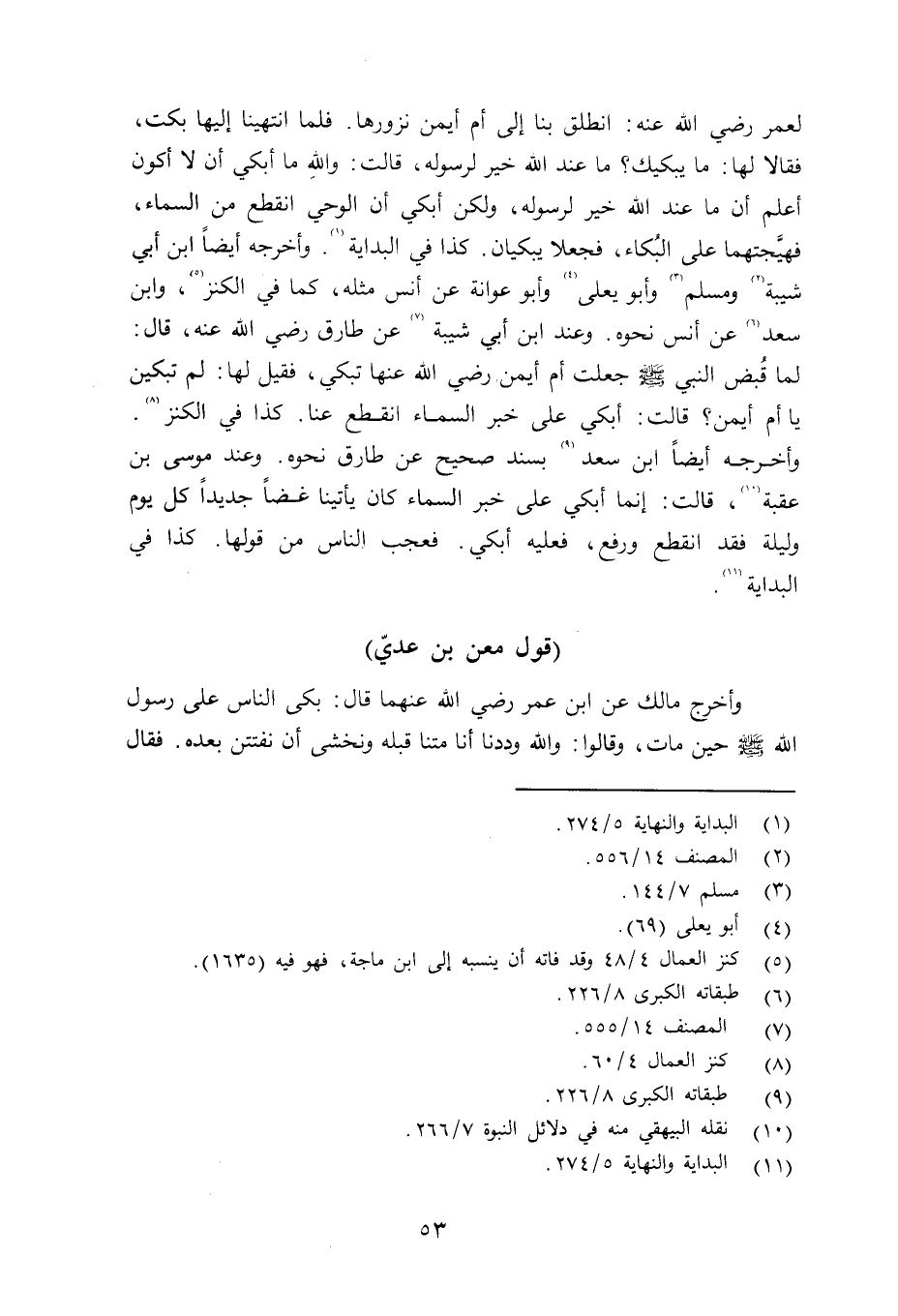 لعمر رضي الله عنه: انطلق بنا إلى أم أيمن نزورها. فلما انتهينا إليها بكت، فقالا لها: ما يبكيك؟ ما عند الله خير لرسوله، قالت: والله ما أبكي أن لا أكون أعلم أن ما عند الله خير لرسوله، ولكن أبكي أن الوحي انقطع من السماء، فيهَّجتهما على البكاء، فجعلا يبكيان. كذا في ابداية. وأخرجه أيضاً ابن أبي شيبة ومسلم وأبو يعلى وأبو عوانة عن أنس مثله، كما في الكنز، وابن سعد عن أنس نحون. وعند ابن أبي شيبة عن طارق رضي الله عنه قال: لما قُبض النبي صلى الله عليه وسلم جعلت أم أيمن رضي الله عنها تبكي، فقيل لها: لم تبكين يا أم أيمن؟ قالت: أبكي على خبر السماء انقطع عنا. كذا في الكنز. وأخرجه أيضاً ابن سعد بسند صحيح عن طارق نحو. وعند موسى بن عقبة قالت: إنما أبكي على خبر السماء كأن يأتينا غضاً جديداً كل يوم وليلة فقد انقطع ورفع، فعليه أبكي. فعجب الناس من قولها. كذا في البداية.
