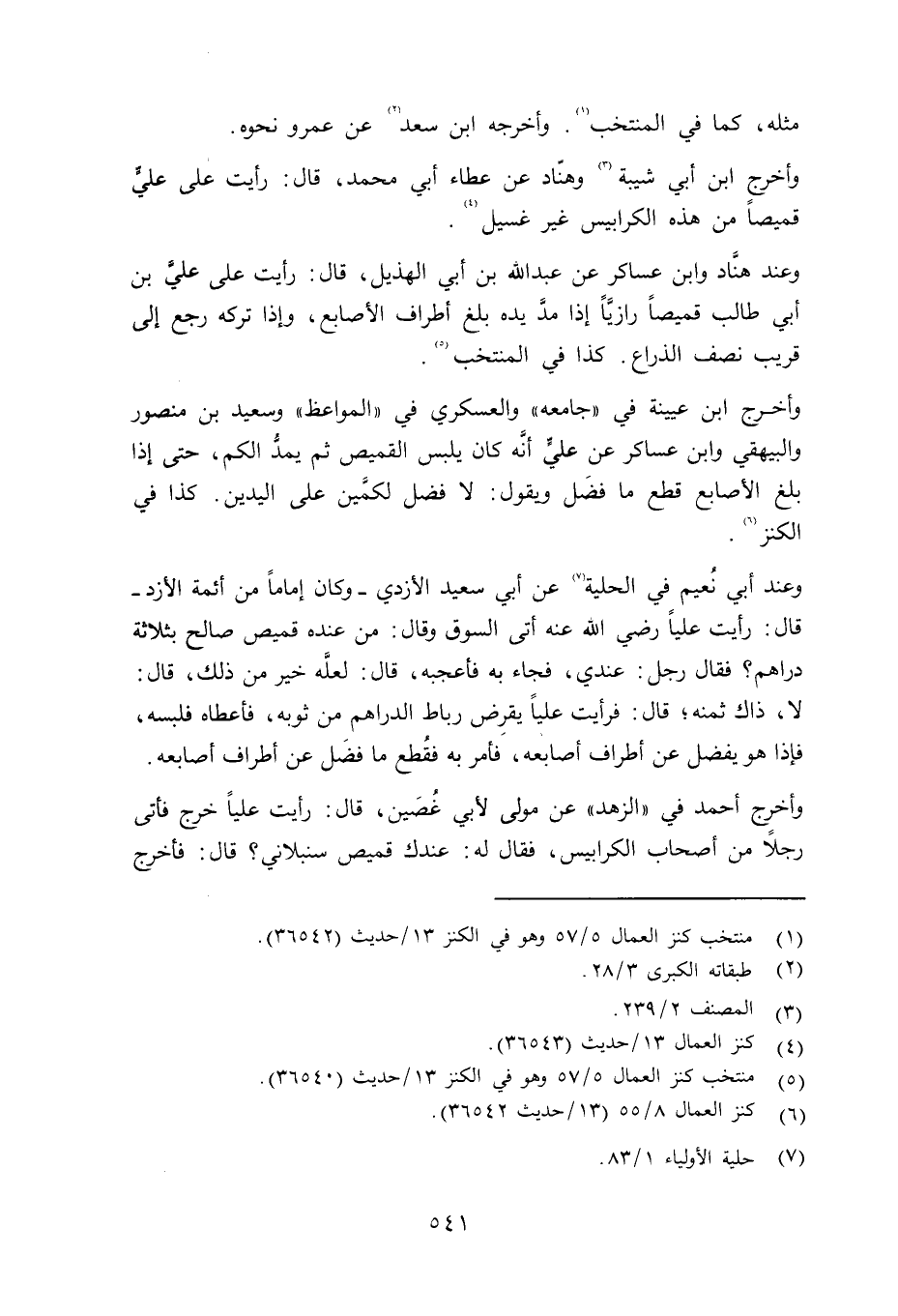 مثله، كما في المنتخب. وأخرجه ابن سعد عن عمرو نحوه. وأخرج ابن أبي شيبة وهنّاد عن عطاء أبي محمد قال: رأيت على عليَّ قميصاً من هذه الكرابيس غير غسيل. وعند هنَّاد وابن عساكر عن عبد الله بن أبي الهذيل قال: رأيت على عليَ بن أبي طالب قميصاً رازيَّاً إذا مدَّ يده بلغ أطراف الأصابع، وإذا تركه رجع إلى قريب نصف الذراع. كذا في المنتخب. وأخرج بن عيينة في جامعه والعسكري في المواعظ وسعيد بن منصور والبيهقي وابن عساكر عن عليَ أنَّه كان يلبس القميص ثم يمدُّ الكم، حتى إذا بلغ الأصابع قطع ما فضَل ويقول: لا فضل لكمَّين على اليدين. كذا في الكنز.