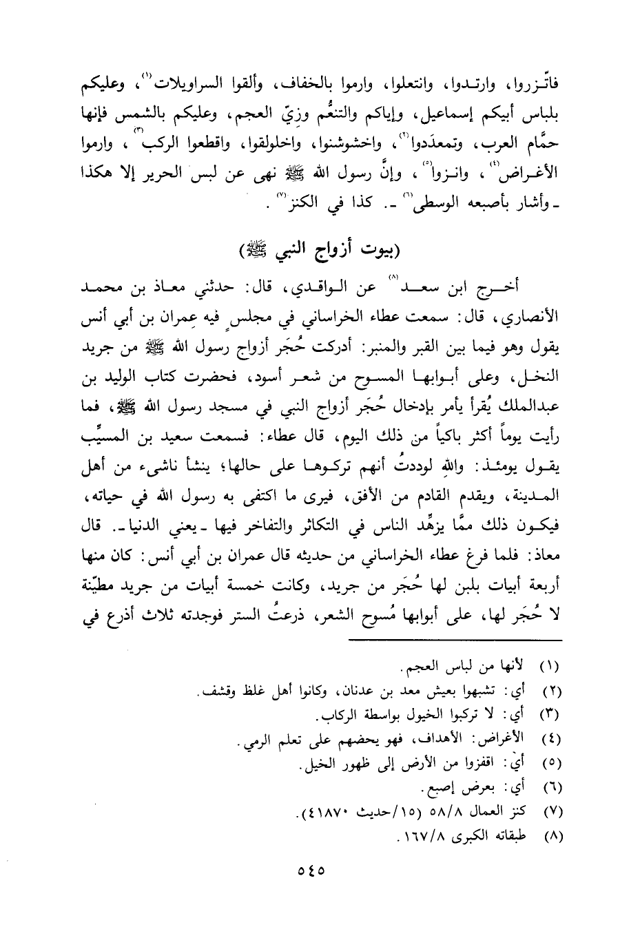 أخرج ابن سعد: عن الواقدي قال: حدثني معاذ بن محمد الأنصاي قال: سمعت عطاء الخراساني في مجلس فيه عِمران بن أبي أنس يقول وهو فيما بين القبر والمنبر: أدركت حُجَر أزواج رسول الله صلى الله عليه وسلم من جريد انلخل، وعلى أبوابها المسوح من شعر أسود، فحضرت كتاب الوليد بن عبد الملك يُقرأ يأمر بإدخال حُجَر أزواج النبي في مسجد رسول الله، فما رأيت يوماً أكثر باكياً من ذلك اليوم، قال عطاء: فسمعت سعيد بن المسيِّب يقول يومئذ: واللَّهِ لوددتُ أنهم تركوها على حالها؛ ينشأ ناشىء من أهل المدينة، ويقدم القادم من الأفق، فيرى ما اكتفى به رسول الله في حياته، فيكون ذلك ممَّا يزهِّد الناس في التكاثر والتفاخر فيها - يعني الدنيا -. قال معاذ: فلما فرغ عطاء الخراساني من حديثه قال عمران بن أبي أنس: كان منها أربعة أبيات بلبن لها حُجَر من جريد، وكانت خمسة أبيات من جريد مطيّنة لا حُجعر لها، على أبوابها مُسوح الشعر، ذرعتُ الستر فوجدته ثلاث أذرع في