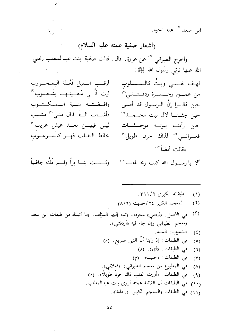 وأخرج الطبراني عن عروة قال: قالت صفية بنت عبد المطلب رضي الله عنها ترثي رسول الله صلى الله عليه وسلم