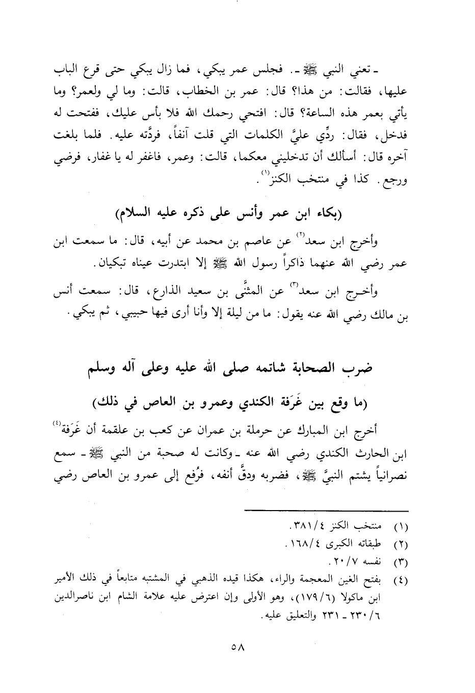 وأخرج ابن سعد عن عاصم بن محمد عن أبيه قال: ما سمعت ابن عمر رضي الله عنهما ذاكراً رسول الله صلى الله عليه وسلم إلا ابتدرت عيناه تبكيان. وأخرج ابن سعد عن المثنَّى بن سعيد الذارع قال: سمعت أنس بن مالك رضي الله عنه يقول: ما من ليلة إلا وأنا أرى فيها حبيب ثم يبكي.