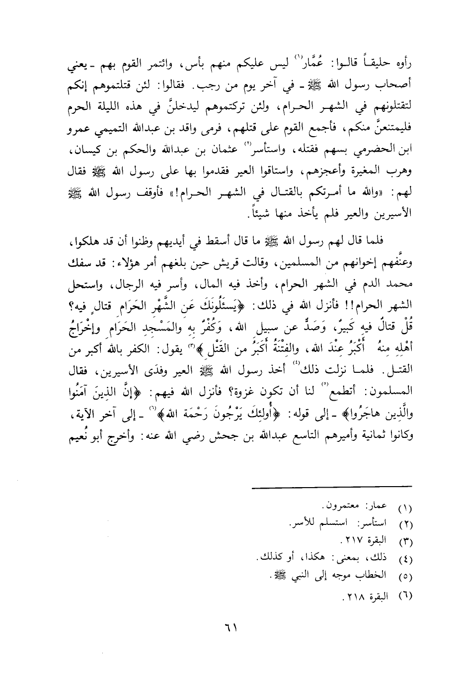 فلما قال لهم رسول الله صلى الله عليه وسلم ما قال أسقط في أيديهم وظنوا أن قد هلكوا، وعنَّفهم إخوانهم من المسلمين، وقالت قريش حين بلغهم أمر هؤلاء: قد سفك محمد الدم في الشهرا الحرام، وأخذ فيه المال، وأسر فيه الرجال، واستحل الشهر الحرام فأنزل الله في ذلك: {يَسْئَلُونَكَ عَنِ الشَّهْرِ الْحَرَامِ قِتَالٍ فِيهِ} {قُلْ قِتَالٌ فِيهِ كَبِيرٌ} {وَصَدٌّ عَن سَبِيلِ اللَّهِ} {وَكُفْرٌ بِهِ وَالْمَسْجِدِ الْحَرَامِ وَإِخْرَاجُ أَهْلِهِ مِنْهُ} {أَكْبَرُ عِندَ اللَّهِ وَالْفِتْنَةُ أَكْبَرُ مِنَ الْقَتْلِ} (سورة البقرة، الآية: 217) يقول: الكفر بالله أكبر من القتل. فلما نزلت ذلك أخذ رسول الله صلى الله عليه وسلم العير وفدَى الأسيرين، فقال المسلمون: أتطمع لنا أن تكون غزوة؟ فأنزل الله فيهم: {إِنَّ الَّذِينَ ءامَنُواْ وَالَّذِينَ هَاجَرُواْ} -إلى قوله: {أُوْلئِكَ يَرْجُونَ رَحْمَةَ اللَّهِ} (سورة البقرة، الآية: 218) - إلى آخر الآية، وكانوا ثمانية وأميرهم التاسع عبد الله بن جحش رضي الله عن. وأخرج أبو نُعيم