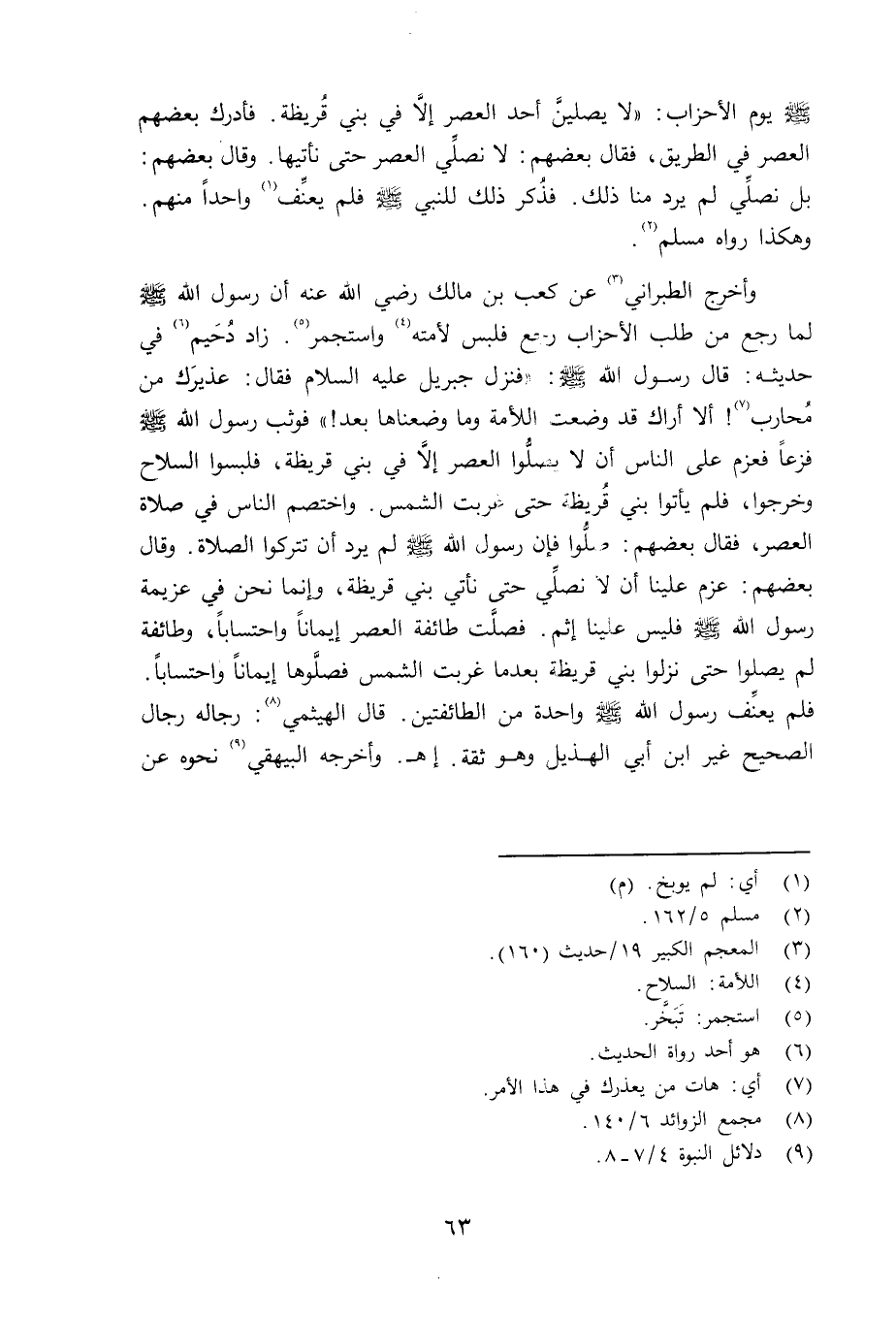 وأخرج الطبراني عن كعب بن مالك رضي الله عنه أن رسول الله صلى الله عليه وسلم لما رجع من طلب الأحزاب رجع فلبس لأمته واستجمر. زاد دُحَيم في حديثه: قال رسول الله صلى الله عليه وسلم «فنزل جبريل عليه السلام فقال: عذيرَك من مُحارب ألا أراك قد وضعت اللأمة وما وضعناها بعد» فوثب رسول الله صلى الله عليه وسلم فزعاً فعزم على الناس أن لا يصلُّوا العصر إلاَّ في بني قريظة، فلبسوا السلاح وخرجوا، فلم يأتوا بني قُريظة حتى غربت الشمس. واختصم الناس في صلاة العصر، فقال بعضهم: صلُّوا فإن رسول الله صلى الله عليه وسلم لم يرد أن تتركوا الصة. وقال بعضهم: عز علينا أن لا نصلِّي حتى نأتي بني قريظة، وإنما نحن في عزيمة رسول الله صلى الله عليه وسلم فليس علينا إثم. فصلَّت طائفة العصر إيماناً واحتساباً. وطائفة لم يصلوا حتى نزلوا بني قريظة بعدما غربت الشمس فصلَّوها إيماناً واحتساباً. فلم يعنِّف رسول الله صلى الله عليه وسلم واحدة من الطائفتني. قال الهيثمي: رجاله رجال الصحيح غير ابن أبي الهذيل وهو ثقة اهـ. وأخرجه البيهقي نحوه عن