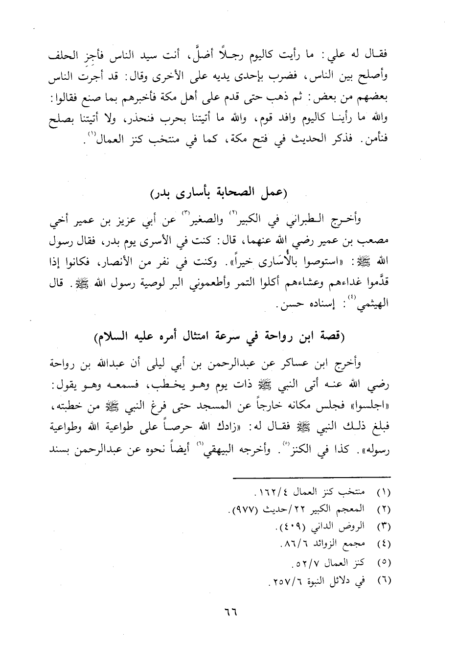 وأخرج الطبراني في الكبير والصغير عن أبي عزيز بن عمير أخي مصعب بن عمير رضي الله عنهما قال: كنت في الأسرى يوم بدر، فقال رسول الله صلى الله عليه وسلم «استوصوا بالأسَارى خيراً» . وكنت في نفر من الأنصار، فكانوا إذا قدَّموا غداءهم وعشاءهم أكلوا التمر وأطعموني البر لوصية رسول الله صلى الله عليه وسلم قال الهيثمي: إسناده حسن.