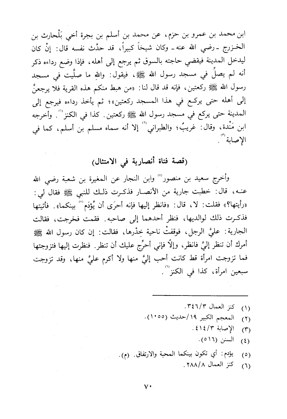 بن محمد بن عمرو بن حزم عن محمد بن أسلم بن بجرة أخي بلحارث بن الخزرج - رضي الله عنه - وكان يخاً كبيراً. قد حدَّث نفسُه قال: إنْ كان ليدخل المدينة فيقضي حاجته بالسوق ثم يرجع إلى أهله، فإذا وضع رداءه ذكر أنه لم يصلِّ في مسجد رسول الله صلى الله عليه وسلم فيقول: والله ما صلَّيت في مسجد رسول الله صلى الله عليه وسلم ركعتين، فإنه قد قال لنا: «من هبط منكم هذه القرية فلا يرجعنَّ إلى أهله حتى يركع في هذا المسجد ركعتين» . كذا في الكنز. وأخرج ابن مَنْده وقال: غريب؛ والطبراني إلا أنه سماه مسلم بن أسلم، كما في الإِصابة.