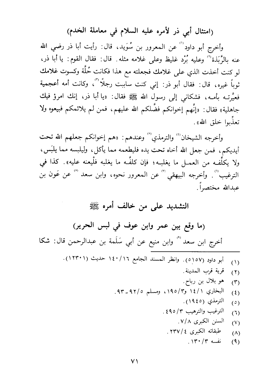 وأخرج أبو داود عن المعرور بن سُوَيد قال: رأيت أبا ذر رضي الله عنه الرَّبَذة وعليه بُرْد غليظ وعلى غلامه مثله. قال: فقال القوم: يا أبا ذر، لو كنت أخذت الذي على غلامك فجعلته مع هذا فكانت حُلَّة وكسوت غلامك ثوباً غيره، قال: فقال أبو ذر: إني كنت ساببت رجلاً، وكانت أمه أعجمية فعيَّرته بأمه، فشكاني إلى رسول الله صلى الله عليه وسلم فقال: «يا أبا ذر، إنك امرؤ فيك جاهلية» فقال: «إنَّهم إخوانكم فضَّلكم الله عليهم، فمن لم يلائمكم فبيعوه ولا تعذِّبوا خلق الله» .