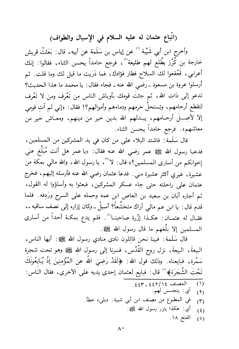 قال سَلَمة: فاشتد البلاء على من كان في يد المشركين من المسلمين، فدعا رسول الله صلى الله عليه وسلم عمر رضي الله عنه فقال: «يا عمر هل أنت مُبَلِّغ عني إخوانكم من أسارى المسلمين؟» قال: لا، يا رسول الله، والله مالي بمكة من عشيرة، غيري أكثر عشيرة مني. فدعا عثمان رضي الله عنه فأرسله إليهم، فخرج عثمان على راحلته حتى جاء عسكر المشركين، فعبثوا به وأساؤوا له القول، ثم أجاره أبان بن سعيد بن العاص ابن عمه وحمله على السرج ورَدِفه. فلما قدم قال: يا ابن عم مالي أراك متخشِّعاً؟ أسبلْ - وكان إزاره إلى نصف ساقيه -، فقال له عثمان: هكذا إزْرة صاحبنا. فلم يدع بمكة أحداً من أسارى المسلمين إلا بلَّغهم ما قال رسول الله صلى الله عليه وسلم