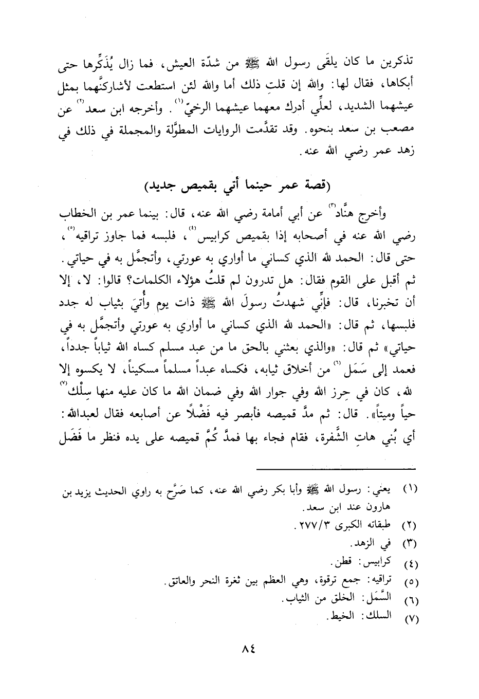 وأخرج هنَّاد عن أبي أمامة رضي الله عنه قال: بينما عمر بن الخطاب رضي الله عنه في أصحابه إذا بقميص كرابيس، فلبسه فما جاوز تراقيه، حتى قال: الحمد الله الذي كساني ما أواري به عورتي، وأتجمَّل به في حياتي. ثم أقبل على القوم فقال: هل تدرون لم قلتُ هؤلاء الكلمات؟ قالوا: لا، إلا أن تخبرنا، قال: فإنِّي شهدت رسول الله صلى الله عليه وسلم ذات يوم وأُتيَ بثياب له جدد فلبسها، ثم قال: «الحمد لله الذي كساني ما أمواي به عورتي وأتجمَّل به في حياتي» ثم قال: «والذي بعثني بالحق ما من عبد مسلم كساه الله ثياباً جدداً، فعمد إلى سَمَل من أخلاق ثيابه، فكساه عبداً مسلماً مسكيناً، لا يكسوه، إلا لله، كان في حِرز الله وفي جوار الله وفي ضمان الله ما كان عليه منها سِلْك حياً وميتاً» . قال: ثم مدَّ قميصه فأبصر فيه فضلاً عن أصابعه فقال لعبد الله: أي بني هاتِ الشفرة، فقام فجاء بها فمدَّ كُمَّ قميصه على يده فنظر ما فَضَل