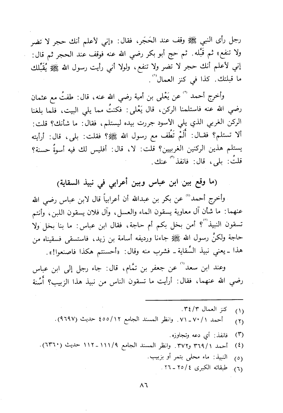 وأخرج أحمد عن بكر بن عبد الله أن أعرابياً قال لابن عباس رضي الله عنهما: ما شأن آل معاوية يسقون الماء والعسل، وآل فلان يسقون اللبن، وأنتم تسقون النبيذ؟ أمن بخل بكم أم حاجة، فقال ابن عباس: ما بنا بخل ولا حاجة ولكنَّ رسول الله صلى الله عليه وسلم جاءنا ورديفه أسامة بن زيد، فاستسقى فسقيناه من هذا - يعني نبيذ السِّقاية - فشرب منه وقال: «أحسنتم هكذا فاصنعوا» .