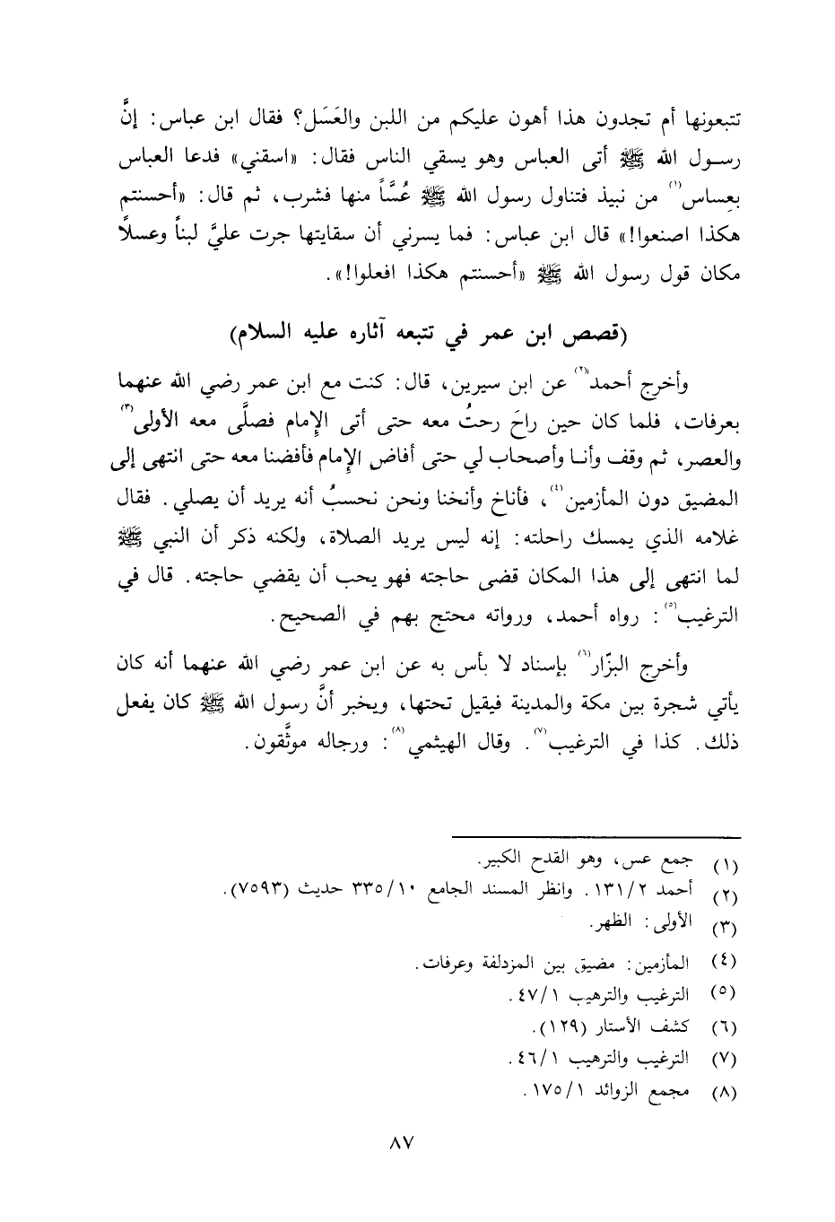 وأخرج أحمد عن ابن سيرين قال: كنت مع ابن عمر رضي الله عنهما بعرفات، فلما كان حين راح رحت معه حتى أتى الإمام فصلَّى معه الأولى والعصر، ثم وقف وأنا وأصحاب لي حتى أفاض الإِمام فأفضنا معه حتى انتهى إلى المضيق دون المأزمين، فأناخ وأنخنا ونحن نحسب أنه يريد أن يصلي. فقال غلامه الذي يمسك راحلته: إنه ليس يريد الصلاة، ولكنه ذكر أن النبي صلى الله عليه وسلم لما انتهى إلى هذا المكان قضى حاجته فهو يحب أن يقضي حاجته. قال في الترغيب: رواه أحمد، ورواته محتج بهم في الصحيح.