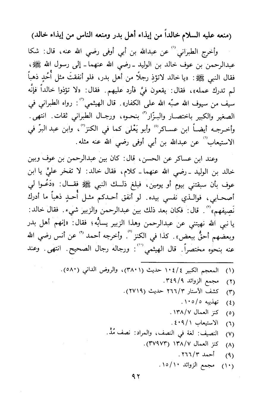 وأخرج الطبراني عن عبد الله بن أبي أوفى رضي الله عنه قال: شكا عبد الرحمن بن عوف خالد بن الوليد - رضي الله عنهما - إلى رسول الله صلى الله عليه وسلم فقال النبي صلى الله عليه وسلم «يا خالد لا تؤذِ رجلاً من أهل بدر، فلو أنفقتَ مثل أُحُدٍ ذهباً لم تدرك عمله» ، فقال: يقعون فيَّ فأرد عليهم. فقال: «لا تؤذوا خالداً فإنَّه سيف من سيوف الله صبّه الله على الكفار» . قال الهيثمي: رواه الطبراني في الصغير والكبير باختصار والبزّار بنحون، ورجال الطبراني ثقات. انتهى. وأخرجه أيضاً ابن عساكر وأبو يَعْلى كما في الكنزل، وابن عبد البرِّ في الاستيعاب عن عبد الله بن أبي أوفى رضي الله عنه مثله.
