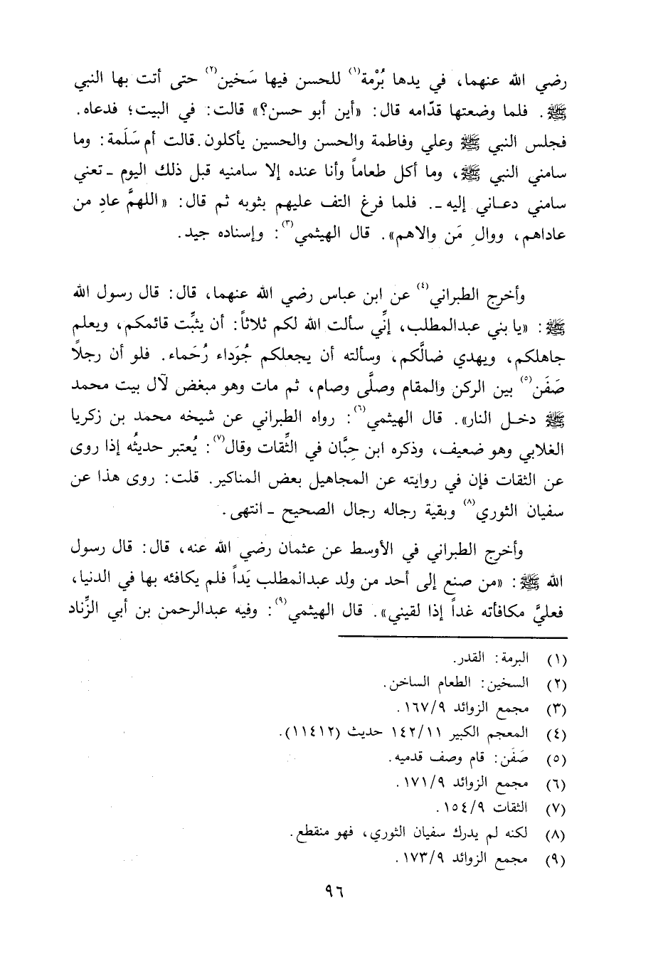 وأخرج الطبراني عن ابن عباس رضي الله عنهما قال: قال رسول الله صلى الله عليه وسلم «يا بني عبد المطلب، إنِّي سألت الله لكم ثلاثاً: أن يثبِّت قائمكم، ويعلم جاهلكم، ويهدي ضالَّكم، وسألته أن يجعلكم جُوَداء رُحَماء. فلو أن رجلاً صَفَن بين الركن والمقام وصلَّى وصام، ثم مات وهو مبغض لآل بيت محمد صلى الله عليه وسلم دخل النار» . قال الهيثمي: رواه الطبراني عن شيخه محمد بن زكريا الغلابي وهو ضعيف. وذكره ابن حِبَّان في الثِّقات وقال: يُعتبر حديثُه إذا روى عن الثقات فإن في روايته عن المجاهيل بعض المناكير. قلت: روى هذا عن سفيان الثوري وبقية رجاله رجال الصحيح - انتهى.