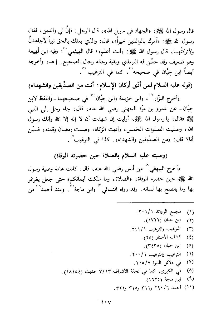 قال رسول الله صلى الله عليه وسلم «الجهاد في سبيل الله» ، قال الرجل: فإنَّ لي والدين، فقال رسول الله صلى الله عليه وسلم «آمرك بالوالدين خيراً» ، قا: والذي بعثك بالحق نبياً لأجاهدنَّ ولأتركنَّهما، قال رسول الله صلى الله عليه وسلم «أنت أعلم» ؛ قال الهيثمي: وفيه ابن لَهيعة وهو ضعيف وقد حسَّن له الترمذي وبقية رجاله رجال الصحيح. اهـ، وأخرجه أيضاً ابن حِبّان في صحيحه، كما في الترغيب.