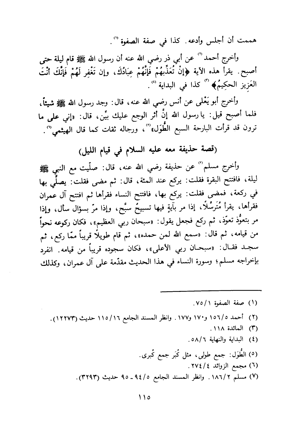 وأخرج مسلم عن حذيفة رضي الله عنه قال: صلَّيت مع النبي صلى الله عليه وسلم ليلة، ففتتح البقرة فقلت: يركع عند المائة، قال: ثم مضى فقلت: يصلِّي بها في ركعة، فمضى فقلت: يركع بها، فاتتح النساء فقرأنا ثم افتتح آل عمران فقرأها، يقرأ مُتَرسِّلاً، إذا مرَّ بآيةٍ فيها تسبيحٌ سبَّح، وإذا مرَّ بسؤال سأل، وإذا مرَّ بتعوُّذ تعوَّذ، ثم ركع فجعل يقول: «سبحان ربي العظيم» ، فكان ركوعه نحواً من قيامه، ثم قال: «سمع الله لمن حمده» ، ثم قام طويلاً قريباً مما ركع، ثم سجد فقال: «سبحان ربي الأعلى» ، فكان سجوده قريباً من قيامه. انفرد بإخراجه مسلم؛ وسورة النساء في هذا الحديث مقدَّمة على آل عمران، وكذلك