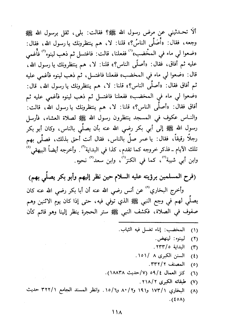 ألاَ تحدثيني عن مرض رسول الله صلى الله عليه وسلم فقالت: بلى، ثقل برسول الله صلى الله عليه وسلم وجعه، فقال: «أصلِّى الناس» ؟ قلنا: لا، هم ينتظرونك يا رسول الله، فقال: «ضعوا لي ماء في المخُضب» ففعلنا، قالت: فاغتسل ثم ذهب لينوء فأُ غمي عليه ثم أفاق، فقال: «أصلَّى الناس» ؟ قلنا: لا، هم ينتظرونك يا رسول الله، قال: «ضعوا لي ماء في المخضب» ففعلنا فاغتسل، ثم ذهب لينوء فأغمي عليه ثم أفاق فقال: «أصلَّى الناس» ؟ قلنا: لا، هم ينتظرونك يا رسول الله، قالت: والناس عكوف في املسجد ينتظرون رسول الله صلى الله عليه وسلم لصلاة العشاء، فأرسل رسول الله صلى الله عليه وسلم إلى أبي بكر رضي الله عنه بأن يصلِّي بالناس، وكان أبو بكر رجلاً رقيقاً، فقال: يا عمر صلِّ بالناس، فقال أنت أحق بذلك، فصلَّى بهم تلك الأيام - فذكر خروجه كما تقدم، كذا في البداية. وأخرجه أيضاً البيهقي وابن أبي شيبة، كما في الكنز وابن سعد نحوه.