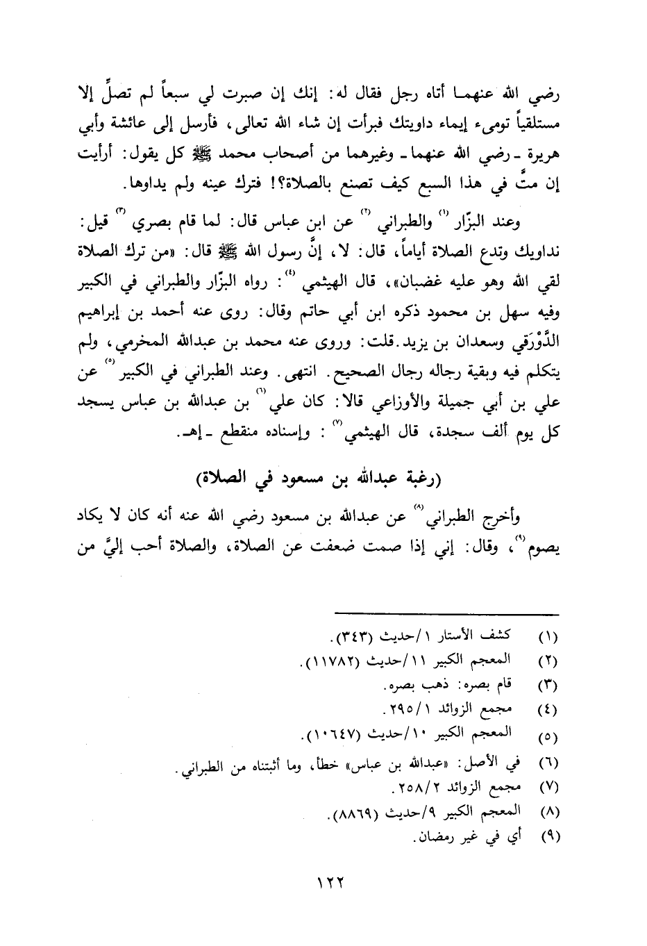 رضي الله عنهما أتاه رجل فقال له: إنك إن صبرت لي سبعاً لم تصلِّ إلاَّ مستلقياً تومىء إيماء داويتك فبرأت إن شاء الله تعالى، فأسل إلى عائشة وأبي هريرة - رضي الله عنهما - وغيرهما من أصحاب محمد صلى الله عليه وسلم كل يقول: أرأيت إن متَّ في هذا السبع كيف تصنع باللاصة؟ فترك عينه ولم يداوها. وعند البزَّار والطبراني عن ابن عباس قال: لما قام بصري قيل: نداويك وتدع الصلاة أياماً، قال: لا، إنَّ رسول الله صلى الله عليه وسلم قال: «من ترك الصلاة لقي الله وهو عليه غضبان» قال الهيثمي: رواه البزّار والطبراني في الكبير وفيه سهل بن محمود ذكره ابن أبي حاتم وقال: روى عنه أحمد بن إبراهيم الدَّوْرَقي وسعدان بن يزيد قلت: وروى عنه محمد بن عبد الله المخرمي ولم يتكلم فيه وبقية رجاله رجال الصحيح. انتهى. وعند الطبراني في الكبير عن علي بن أبي حميلة والأوزاعي قالا: كان عبد الله بن عباس يسجد كل يوم ألف سجدة، قال الهيمثي: وإسنده منقطع - اهـ.
