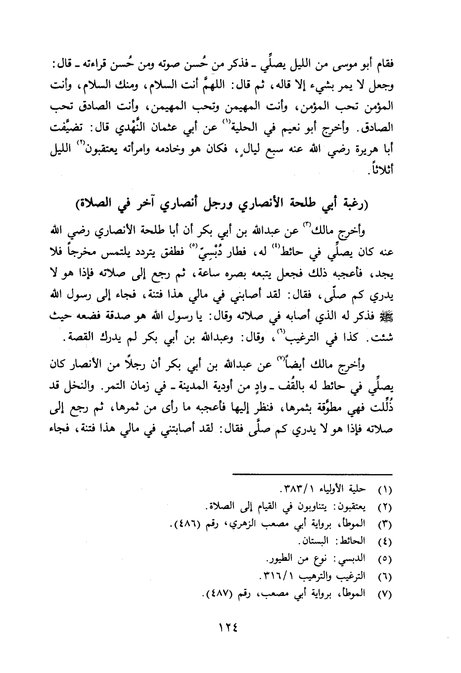 وأخرج مالك عن عبد الله بن أبي بكر أن أبا طلحة الأصناري رضي الله عنه كان يصلِّي في حائط له، فطار دُبْسي فطفق يتردد مخرجاً فلا يجد، فأعجبه ذلك فجعل يتبعه بصره ساعة، ثم رجع إلى صلاته فإذا هو لا يدري كم صلَّى، فقال: لقد أصابني في مالي هذا فتنة، فجاء إلى رسول الله صلى الله عليه وسلم فذكر له الذي أصابه في صلاته وقال: يا رسول الله هو صدقة فضعه حيث شئت. كذا في الترغيب وقال: وعبد الله بن أبي بكر لم يدرك القصة. وأخرج مالك أيضاً عن عبد الله بن أبي بكر أن رجلاف من الأنصار كان يصلِّي في حائط له بالقُف - وادٍ من أودية المدينة - في زمان التر. والنخل قد ذُلِّلت فهي مطوَّقة بثمرها، فنظر إليها فأعجبه ما أرى من ثمرها، ثم رجع إلى صلاته فإذا هو لا يدري كم صلَّى فقال: لقد أصابتني في مالي هذا فتنة، فجاء