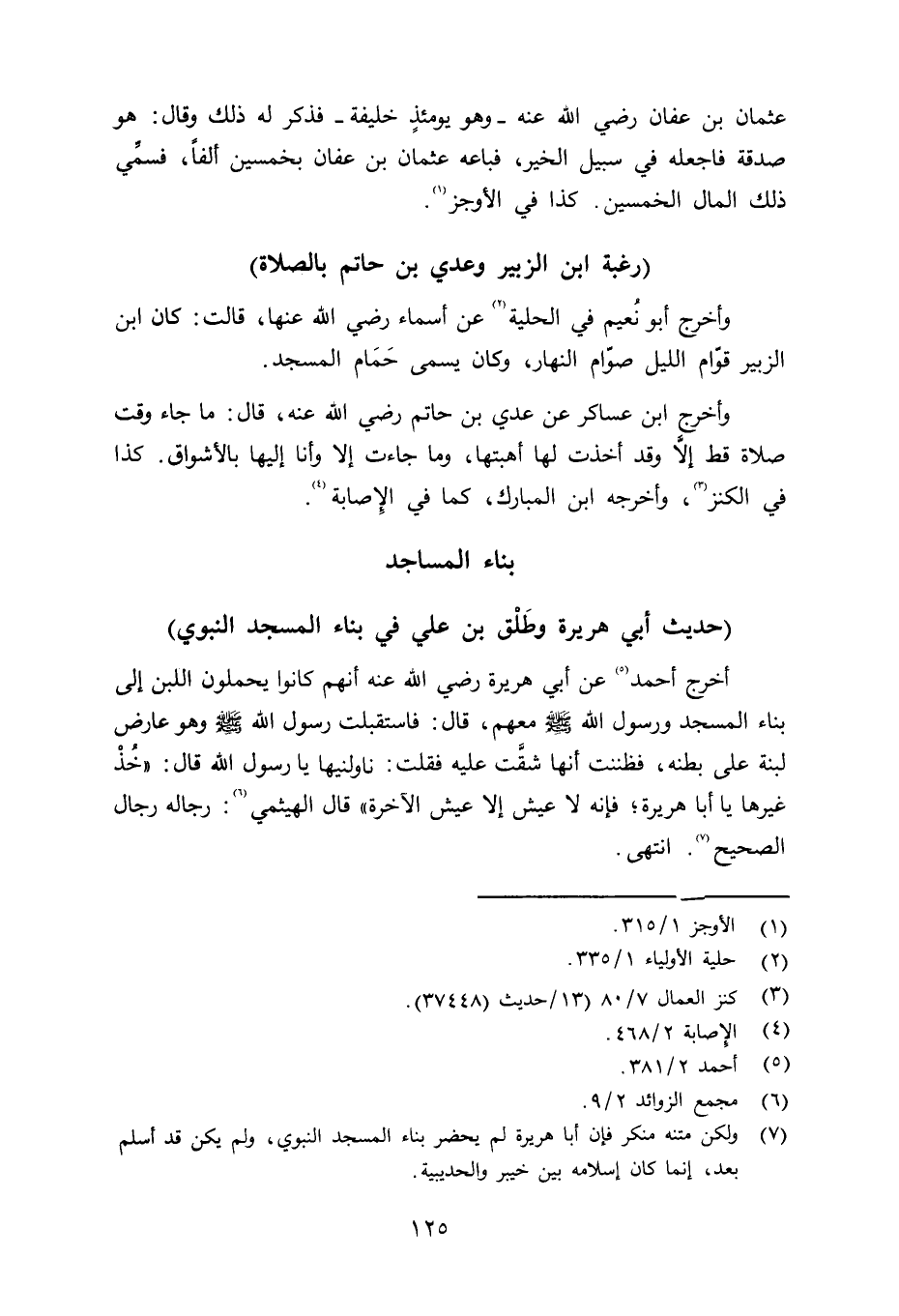 وأخرج أبو نُعيم في الحلية عن أسماء رضي الله عنها قالت: كان ابن الزبير قوَّام الليل صوَّام النهار، وكان يسمى حمام المسجد. وأخرج ابن عساكر عن عدي بن حاتم رضي الله عنه قال: ما جاء وقت صلاة قط إلاَّ وقد أخذت لها أهبتها، وما جاءت إلاَّ وأنا إليها بالأشواق. كذا في الكنز، وأخرجه ابن المبارك، كما في الإِصابة.