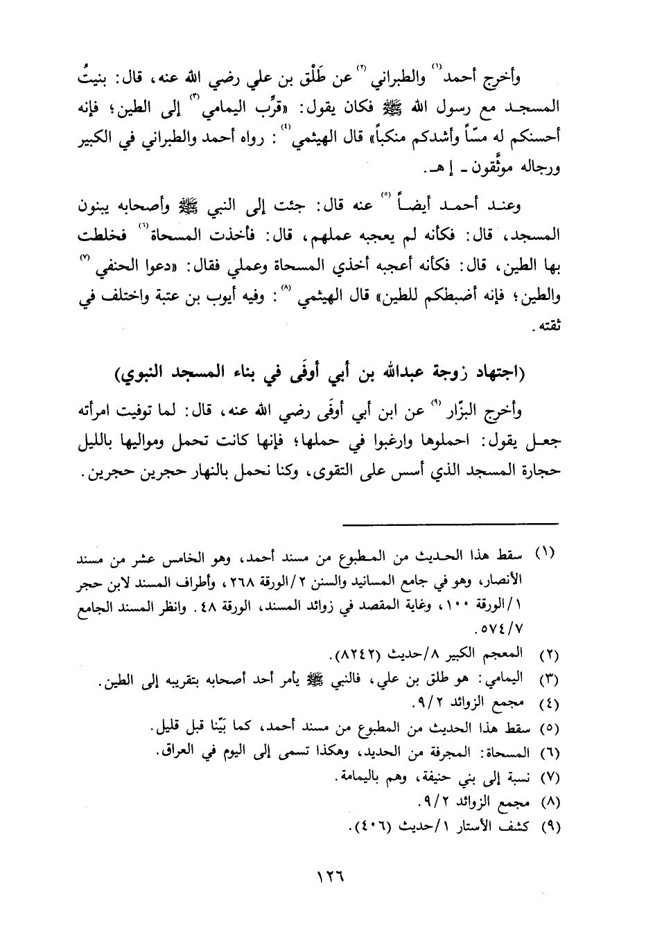 وأخرج أحمد والطبراني عن طَلْق بن علي رضي الله عنه قال: بنيت المسجد مع رسول الله صلى الله عليه وسلم فكان يقول: «قرِّب اليمامي إلى الطين؛ فإنه أحسنكم له مسَّاً وأشدكم منكباً» قال الهيثمي: رواه أحمد والطبراني في الكبير ورجاله موثَّقون - اهـ. وعند أحمد أيضاً عنه قال: جئت إلى النبي صلى الله عليه وسلم وأصحابه يبنون المسجد قال: فكأنه لم عجبه عملهم، قال: فأخذت المسحة فخلطت بها الطين، قال: فكأنه أعجبه أخذي المسحاة وعملي فقال: «دعوا الحنفي والطين؛ فإنه أضبطكم للطين» قال الهيثمي: وفيه أيوب بن عبة واختلف في ثقته.