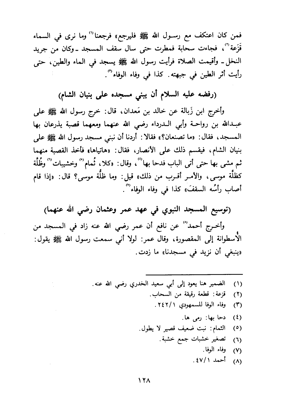 وأخرج أحمد عن نافع أن عمر رضي الله عنه زاد في المسجد من الأْسطوانة لى المقصورة، وقال عمر: لولا أني سمعت رسول الله صلى الله عليه وسلم يقول: «يبنغي أن نزيد في مسجدنا» ما زدت.