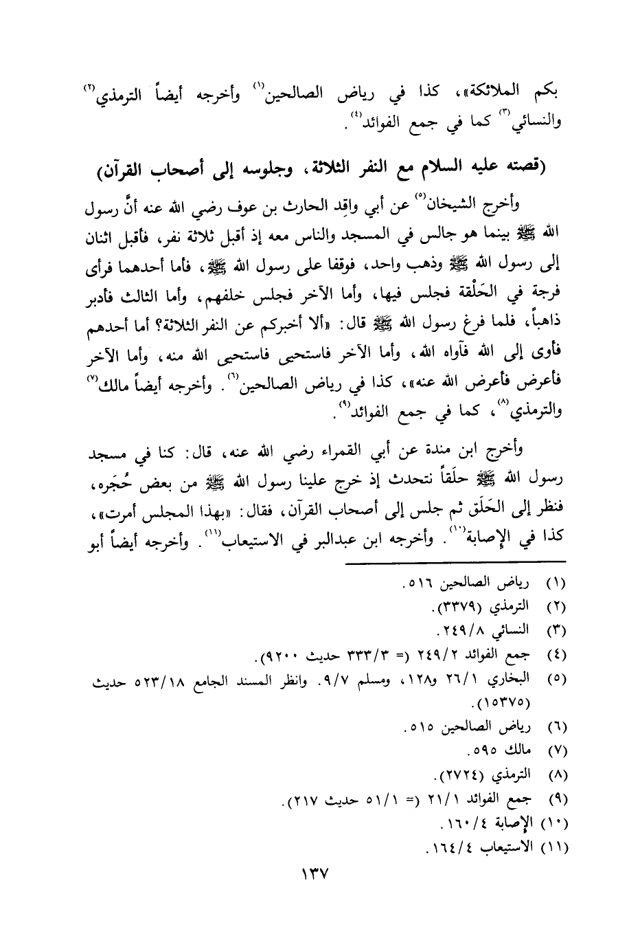 وأخرج الشيخان عن أبي واقد الحارث بن عوف رضي الله عنه أنَّ رسول الله صلى الله عليه وسلم بينما هو جالس في المسجد والناس معه إذ أقبل ثلاثة نفر، فأقبل اثنان إلى رسول الله صلى الله عليه وسلم وذهب واحد، فوقفا على رسول الله صلى الله عليه وسلم فأما أحدهما فرأى فرجة في الحَلْقة فجلس فيها، وأما الآخر فجلس خلفهم، وأما الثالث فأدبر ذاهباً، فلما فرغ رسول الله صلى الله عليه وسلم قال: «ألا أخبركم عن النفر الثلاثة؟ أما أحدهم فأوى إلى الله فآواه الله، وأما الآخر فاستحيي فاستحيى الله منه، وأما الآخر فأعرض فأعرض الله عنه» ، كذا في رياض الصالحين (ص515) . وأخرجه مالك والترمذي، كما في جمع الفوائد. وأخرج ابن منده عن أبي القمراء رضي الله عنه قال: كنا في مسجد رسول الله حلَقاً نتحدث إذ خرج علينا رسول الله صلى الله عليه وسلم من بعض حُجَره، فنظر إلى الحَلَق ثم جلس إلى أصحاب القرآن، فقال: «بهذا الملجس أمرت» ، كذا في الإصابة. وأخرجه ابن عبد البرّ في الاستعياب. وأخرجه أيضاً أبو