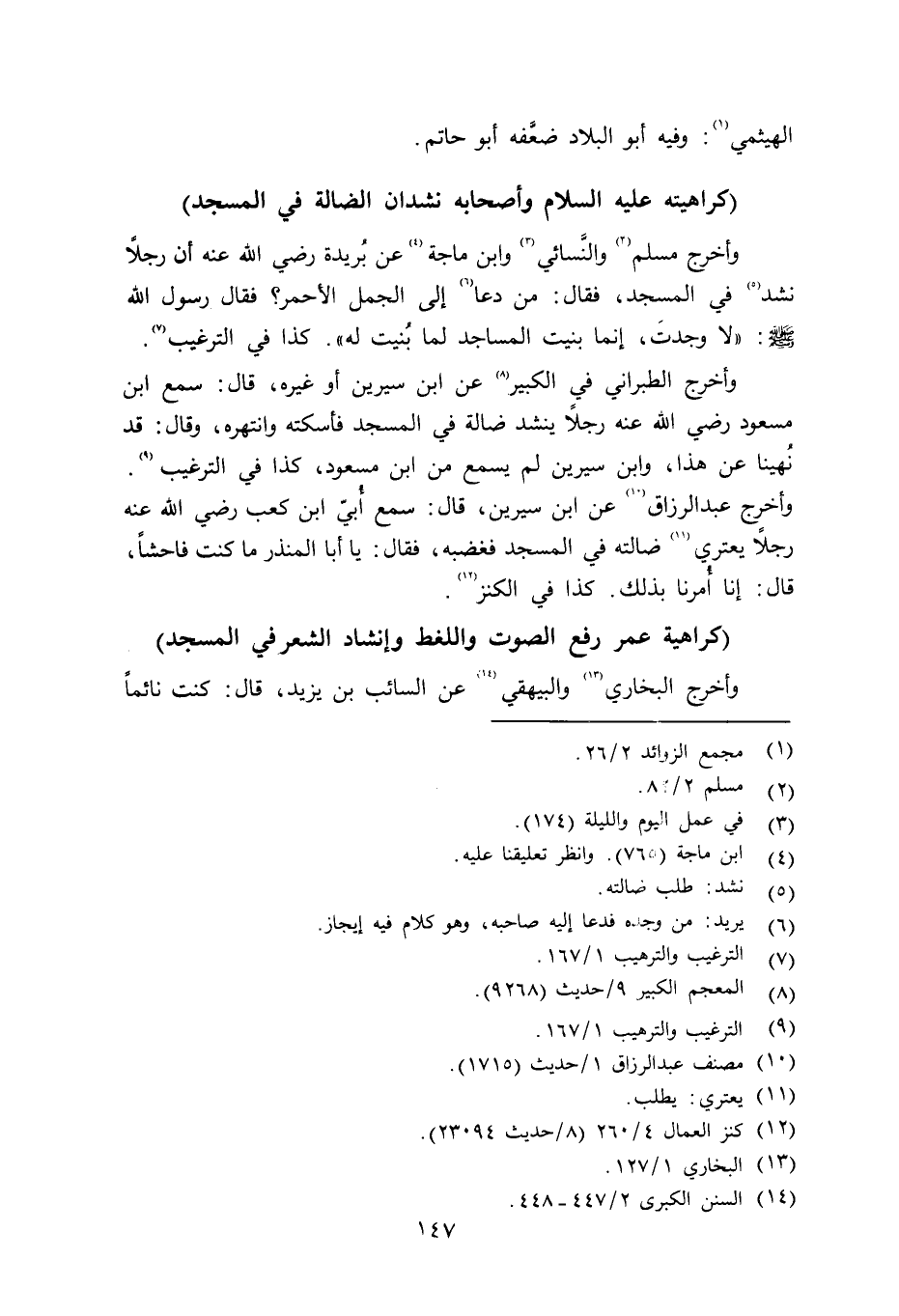 وأخرج مسلم والنِّسائي وابن ماجه عن بُريدة رضي الله عنه أن رجلاً نشد في المسجد، فقال: من دعا إلى الجمل الأحمر؟ فقال رسول الله صلى الله عليه وسلم «لا وجدتَ، إنما بنيت المساجد لما بنيت له» . كذا في الترغيب. وأخرج الطبراني في الكبير عن ابن سيرين أو غيره قال: سمع ابن مسعود رضي الله عنه رجلاً ينشد ضالة في المسجد فأسكته وانتهره، وقال: نُهينا عن هذا، نوابن سيرين لم يسمع من ابن مسعود. كذا في الترغيب. وأخرج عبد الرزاق عن ابن سيرين قال: سمع أُبي ابن كعب رضي الله عنه رجلاً يعتري ضالته في المسجد فغضبه، فقال: يا أبا املنذر ما كنت فاحشاً، قال: إنا أُمرنا بذلك. كذا في الكنز.