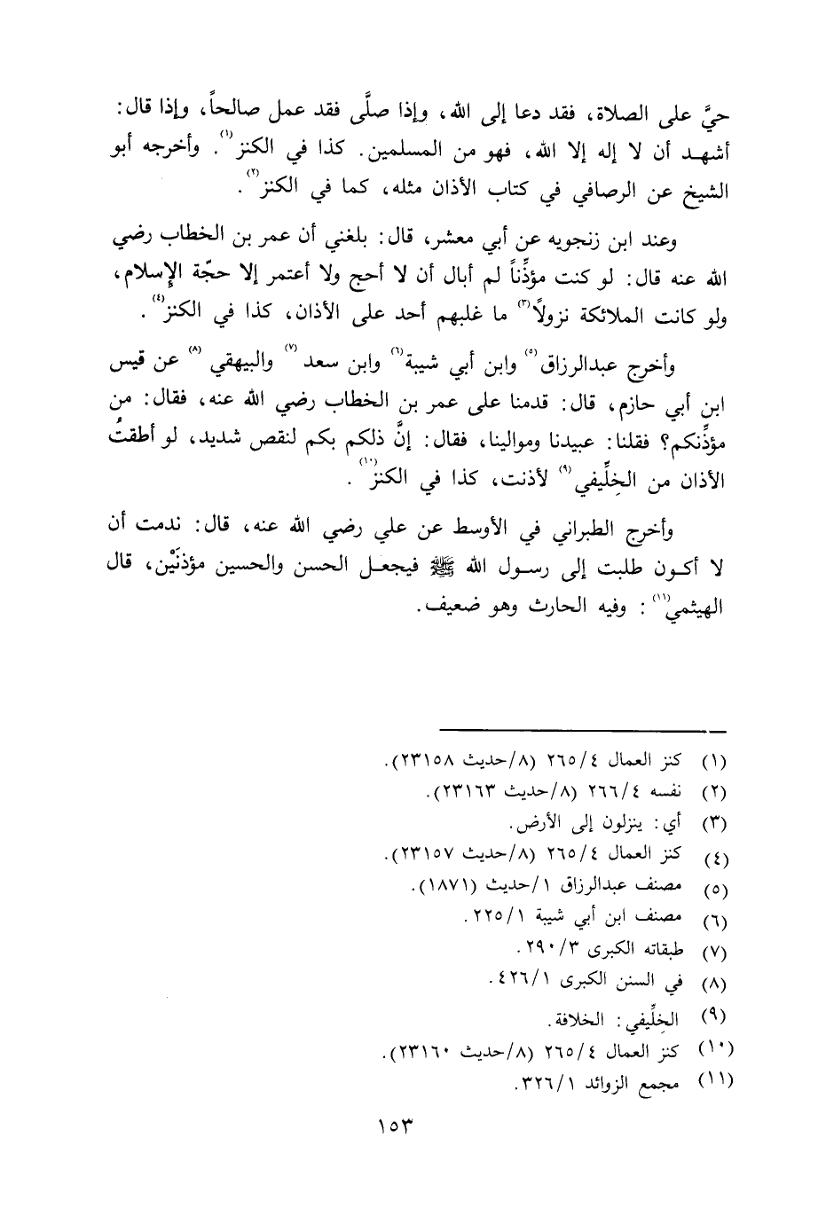 وعند ابن زنجويه عن أبي معشر قال: بلغني أن عمر بن الخطاب رضي الله عنه قال: لو كنت مؤذِّناً لم أبال أن لا أحج ولا أعتمر إلاّ حجّة الإسلام، ولو كانت الملائكة نزولاً ما غلبهم أحد على الأذان، كذا في الكنز. وأخرج عبد الرزاق وابن أبي شيبة وابن سعد والبيهقي عن قيس ابن أبي حازم قال: قدمنا على عمر بن الخطاب رضي الله عنه فقال: من مؤذِّنكم؟ فقلنا: عبيدنا وموالينا، فقال: إنَّ ذلكم بكم لنقص شديد، لو أطقتُ الأذان من الخِلِّفي لأذنت، كذا في الكنز. وأخرج الطبراني في الأوسط عن علي رضي الله عنه قال: ندمت أن لا أكون طلبت إلى رسول الله صلى الله عليه وسلم فيجعل الحسن والحسين مؤذَنَيْن، قال الهيثمي: وفيه الحارث وهو ضعيف.