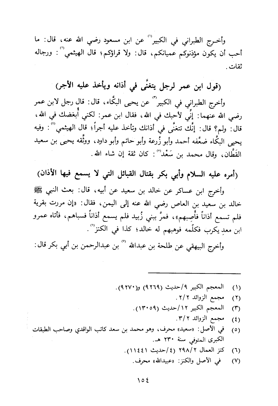 وأخرج الطبراني في الكبير عن ييحى البكَّاء قال: قال رجل لابن عمر رضي الله عنهما: إنِّي لأحبك في الله، فقال ابن عمر: لكني أُبغضك في الله، قال: ولمَ؟ قال إنِّك تتغنَّى في أذانك وتأخذ عليه أجراً؛ قال الهيثمي: وفيه يحى البكَّاء ضعَّفه أحمد وأبو زُرعة وأبو حاتم وأبو داود، ووثَّقه يحيى بن سعد القَطَّان، وقال محمد بن سعيد كان ثقة إن شاء الله.