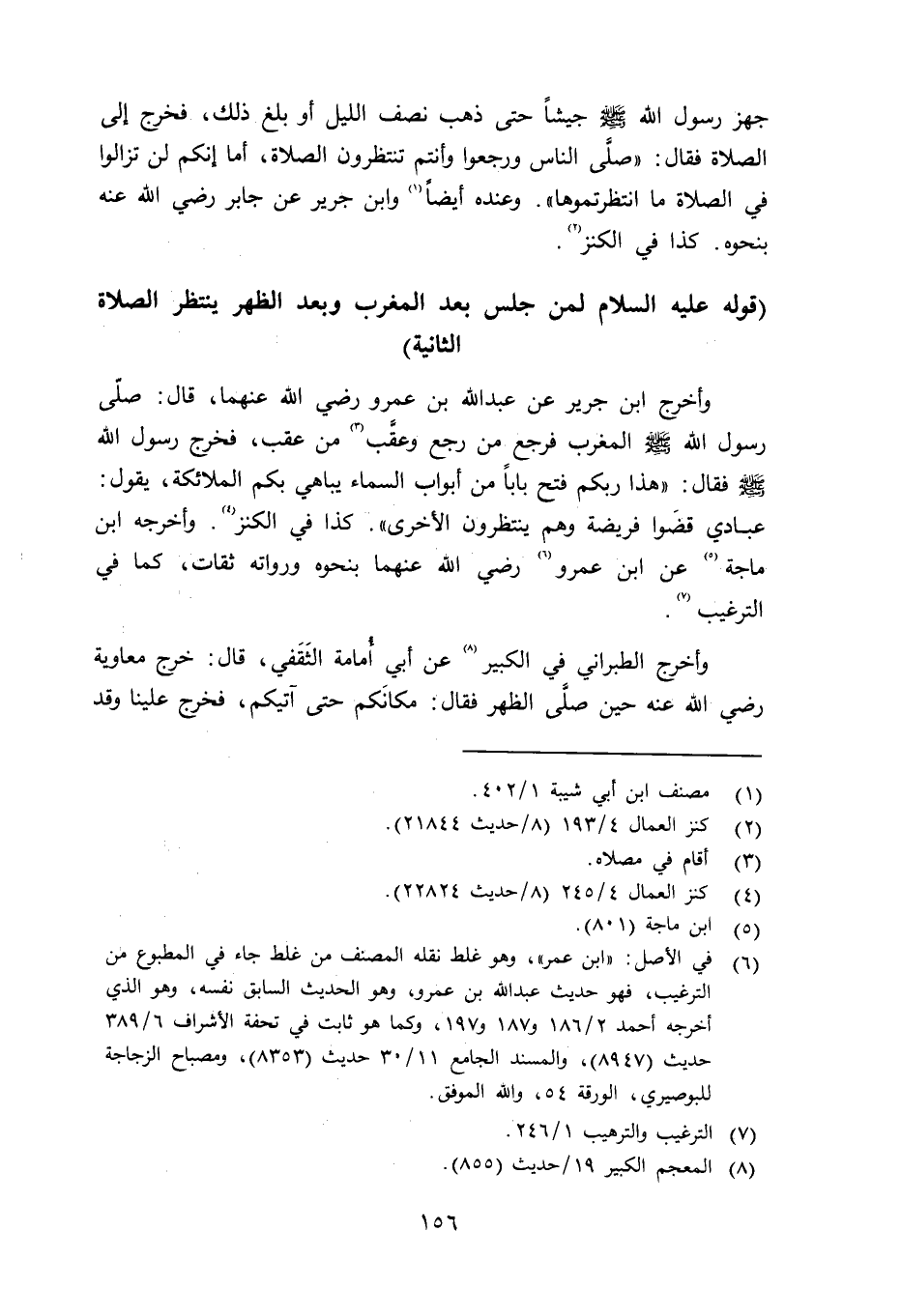 وأخرج ابن جرير عن عبد الله بن عمرو رضي الله عنهما: صلى رسول الله صلى الله عليه وسلم المغرب فرجع من رجع وعقَّب من عقصب، فخرج رسول الله صلى الله عليه وسلم فقال: «هذا ربكم فتح باباً من أبواب السماء يباهي بكم الملائكة، يقول: عبادي قضَوا فريضة وهم ينتظرون الأخرى» . كذا في الكنز. وأخرجه ابن ماجه عن ابن عمر رضي الله عنهما بنحوه ورواته ثقات، كما في التغريب. وأخرج الطبراني في الكبير عن أبي أُمامة الثَقَفي قال: خرج معاوية رضي الله عنه حين صلَّى الظهر فقال: مكانَكم حتى آتيكم، فخرج علينا وقد