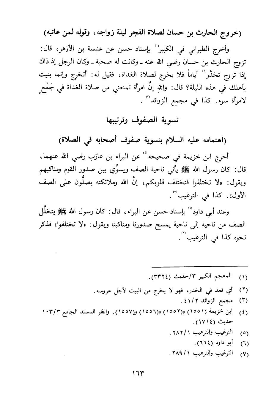 وأخرج الطبراني في الكبير بإسناد حسن عن عنبسة بن الأزهر قال: تزوج الحارث بن حسان رضي الله عنه - وكان له صحبة - وكان ارجل إذ ذاك إذا تزوج تخدَّر أياماً فلا يخرج لصلاة الغداة، فقيل له: أتخرج وإنما بنيت بأهلك في هذه الليلة؟ قال: والله إنَّ امرأة تمنعني من صلاة الغداة في جمع لامرأة سوء. كذا في مجمع الزوائد.