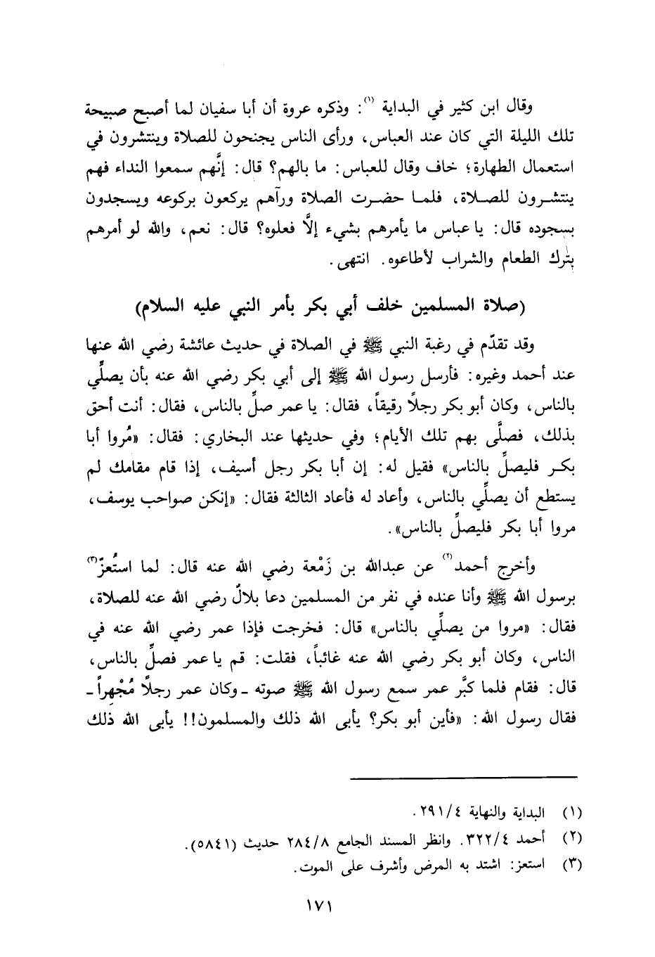 وقد تقدّم في رغبة النبي صلى الله عليه وسلم في الصلاة في حديث عائشة رضي الله عنها عند أحمد وغيره: فأرسل رسول الله صلى الله عليه وسلم إلى أبي بكر رضي الله عنه بأن يصلِّي بالناس، وكان أبو بكر رجلاً رقيقاً، فقال: يا عمر صلِّ بالناس، فقال: أنت أحق بذلك، فصلَّى بهم تلك الأيام؛ وفي حيثها عند البخاري: فقال: «مُروا أبا بكر فليصلِّ بالناس» فقيل له: إن أبا بكر رجل أسيف، إذا قام مقامك لم يستطع أن يصلِّي بالناس، وأعاد فأعادوا له فأعاد الثالثة فقال: «إنكن صواحب يوسف، مروا أبا بكر فليصلِّ بالناس» .