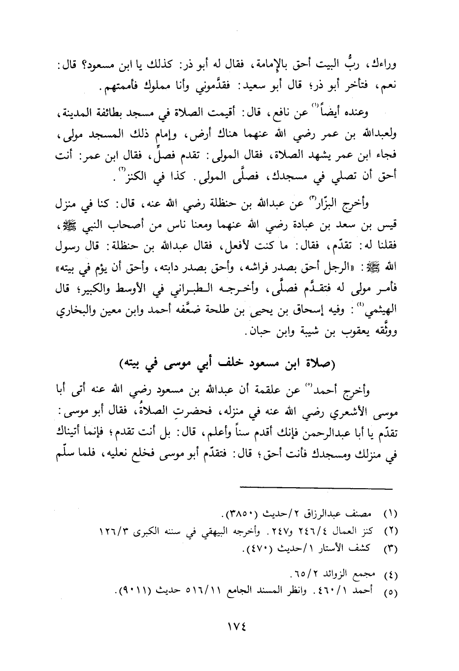 وراءك، ربُّ البيت أحق بالإمامة، فقال له أبو ذر؛ قال أبو سعيد: فقدَّموني وأنا مملوك فأممتهم. وعنده أيضاً عن نافع قال: أقيمت الصلاة في مسجد بطائفة المدينة، ولعبد الله بن عمر رضي الله عنهما هناك أرض، وإمام ذلك المسجد مولى، فجاء ابن عمر يشهد الصلاة، فقال المولى. كذا في الكنز (4246 و247) . وأخرج البزّار عن عبد الله بن حنظة رضي الله عنه قال: كنا في منزل قيس بن سعد ابن عبادة رضي الله عنهم ومعنا ناس من أصحاب النبي صلى الله عليه وسلم فقلنا له: تقدّم، فقال: ما كنت لأفعل، فقال عبد الله بن حنظلة: قال رسول الله صلى الله عليه وسلم «الرجل أحق بصدر فراشه، وأحق بصدر دابته، وأحق أن يؤم في بيته» فيمر مولى له فتقدَّم فصلَّى، وأخرجه الطبراني في الأوسط والكبير؛ قال الهيثمي: وفيه إسحاق بن يحيى بن طلحة ضعَّفه أحمد وابن معين والبخاري ووثَّقه يعقوب بن شيبة وابن حبان.
