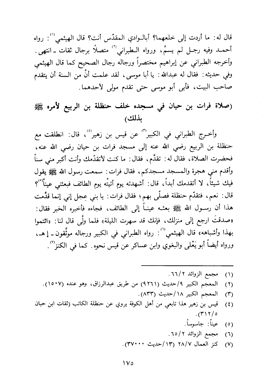 وأخرج الطبراني في الكبير عن قيس بن زهير رضي الله عنه قال: انطلقت مع حنظلة بن الربيع رضي الله عنه إلى مسجد فرات بن حبان رضي الله عنه، فحضرت الصلاة، فقال له: تقدَّم، فقال: ما كنت لأتقدّمك وأنت أكبر مني سناً وأقدم مني هجرة والمسجد مسجدكم، فقال فرات: سمعت رسول الله صلى الله عليه وسلم يقول فيك شيئاً، لا أتقدمك أبداً، قال: أشهدته يوم أتيتُه يوم الطائف فبعثني عيناً؟ قال: نعم، فتقدّم حنظلة فصلّى بهم؛ فقال فرات: يا بني عِجل إني إنما قدَّمت هذا أن رسول الله صلى الله عليه وسلم بعثه عيناً إلى الطائف، فجاءه فأخبره الخبر فقال: «صدقتَ ارجع إلى منزلك، فإنك قد سهرت الليلة» فلما ولَّى قال لنا: «ائتموا بهذا وأشباهه» قال الهيثمي:: رواه الطبراني في الكبير ورجاله موثَّقون - اهـ، ورواه أيضاً أبو يَعْلى والبغوي وابن عساكر عن قيس نحوه. كما في الكنز.