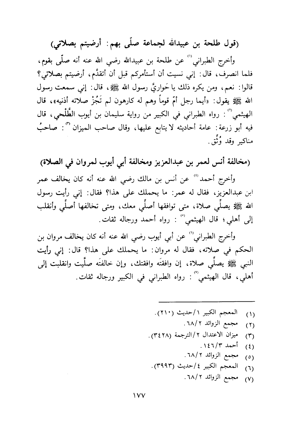 وأخرج الطبراني عن طلحة بن عبيد الله رضي الله عنه أنه صلّى قوم، فلما انصرف قال: إني نسيت أن أستأمركم قبل أن أتقدَّم، أرضيتم بصلاتي؟ قالوا: نعم، ومن يكره ذلك يا حَواريَّ رسول الله صلى الله عليه وسلم قال: إني سمعت رسول الله صلى الله عليه وسلم يقول: «أيما رجل أم قوماً وهم له كارهون لم تَجُزْ صلاته أذنيه» قال الهيثمي: رواه الطبراني في الكبير من رواية سليمان بن أيوب الطلْحي قال فيه أبو زرعة: عامة أحاديثه لا يتابَع عليها، وقال صاحب الميزان: صاحبُ مناكير وقد وُثِّق.