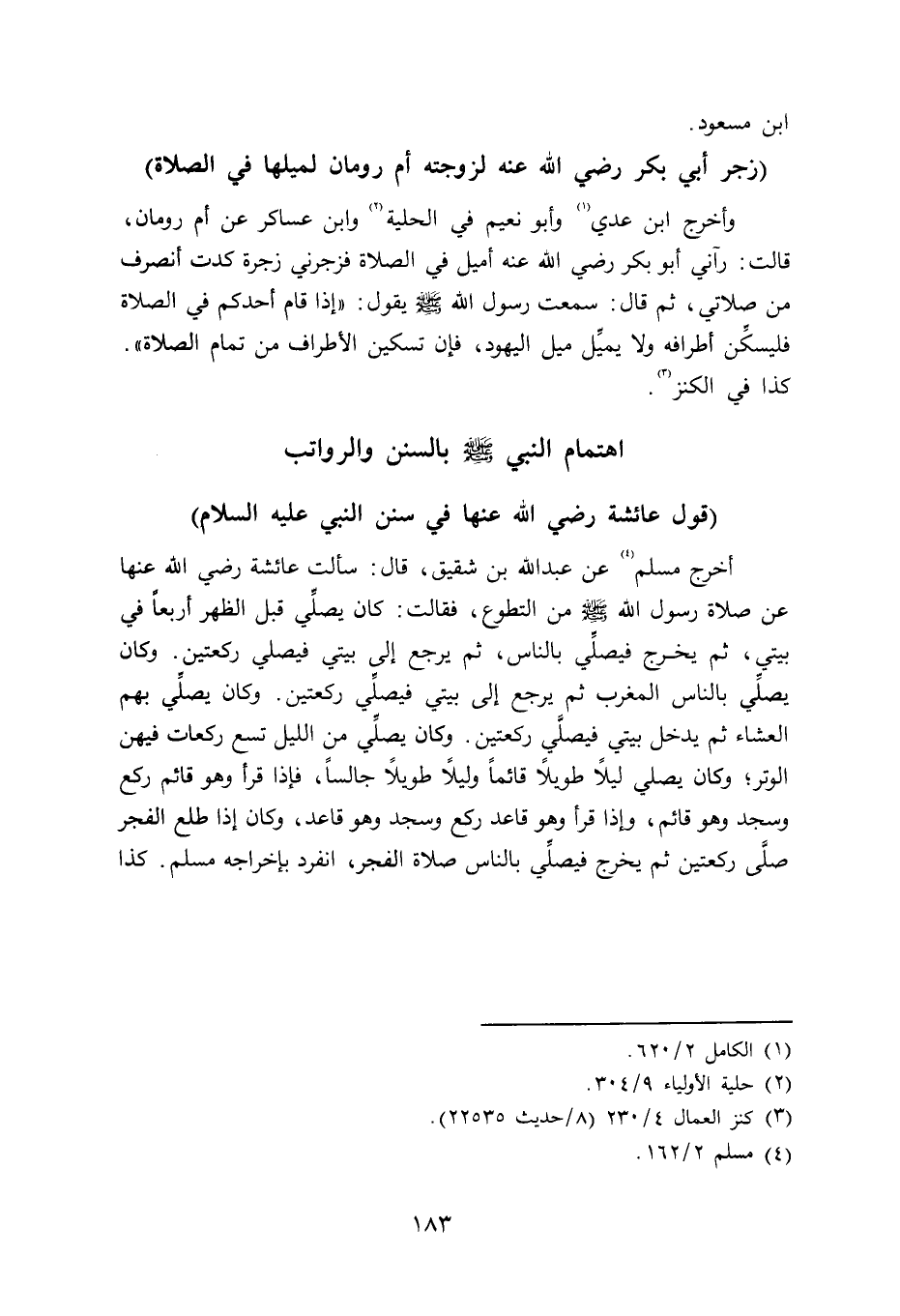 وأخرج ابن عدي وأبو نعيم في الحلية وابن عساكر عن أم رومان قالت: رآني أبو بكر رضي الله عنه أميل في الصلاة فزجرني زجرة كدت أنصرف من صلاتي، ثم قال: سمعت رسول الله صلى الله عليه وسلم يقول: «إذا قام أحدكم في الصلاة فليسكِّن أطرفه ولا يميِّل ميل اليهود، فإن تسكين الأطراف من تمام الصلاة» . كذا في الكنز.