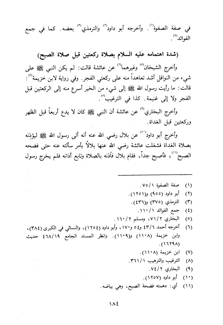 وأخرج الشيخان وغيرهما عن عائشة قالت: لم يكن النبي صلى الله عليه وسلم على شيء من النوافل أشد تعاهداً منه على ركعتي الفجر. وفي رواية لابن خزيمة: قالت: ما رأيت رسول الله صلى الله عليه وسلم إلى شيء من الخير أسرع منه إلى الركعتين قبل الفجر ولا إلى غنيمة: كذا في الترغيب. وأخرج البخاري عن عائشة أن النبي صلى الله عليه وسلم كان لا يدع أربعاً قبل الظهر وركعتين قبل الغداة. وأخرج أبو داود عن بلاد رضي الله عنه أنه أتى رسول الله صلى الله عليه وسلم ليؤذِنه بصلاة الغداة فشغلت عائشة رضي الله عنها بلالاً بأمر سألته عنه حتى سألته عنه حتى فضحه الصبح، فأصبح جداً، فقام بلال فآذنه بالصلاة وتابع أذانه فلم يخرج رسول