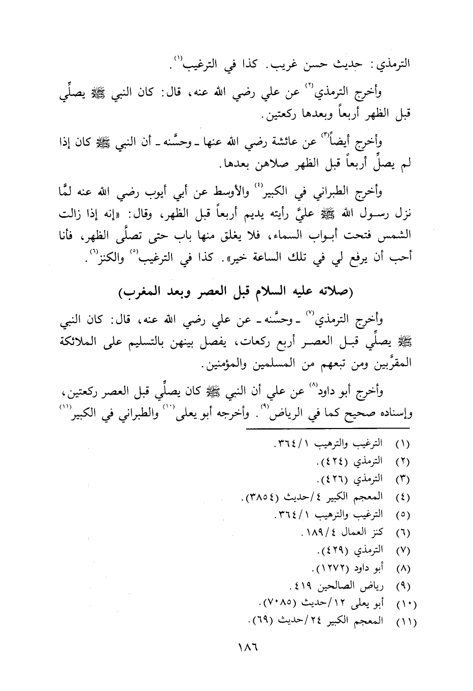 وأخرج الترمذي (ص58) - وحسَّنه - عن علي رضي الله عنه قال: كان النبي صلى الله عليه وسلم يصلِّي قبل الصعري أربع ركعات، يفصل بينهن بالتسليم على الملائكة المقرَّبين ومن تبعهم من المسلمين والمؤمنين. وأخرج أبو داود عن علي أن النبي صلى الله عليه وسلم كان يصلِّي قبل العصر ركعتين، وإسناده صحيح كما في الرياض (ص419) ، وأخرجه أبو يعلى والطبراني في الكبير