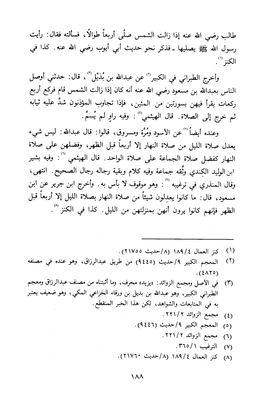 طالب رضي الله عنه إذا زالت الشمس صلّى أربعاً طوالاً، فسألته فقال: رأيت رسول الله صلى الله عليه وسلم يصليها - فذكر نحو حديث أبي أيوب رضي الله عنه. كذا في الكنز وأخرج الطبراني في الكبير عن عبد الله بن يزيد قال: حدثني أوصل الناس بعبد الله بن مسعود رضي الله عنه أنه كان إذا زالت الشمس قام فركع أربع ركعات يقرأ فيهن بسورتين من المِئين، فإذا تجاوب المؤذنون شدَّ عليه ثيابه ثم خرج إلى الصلاة. قال الهيثمي: وفيه راوٍ لم يُسمَّ. وعنده أيضاً عن الأسود ومُرَّة ومسروق قالوا: قال عبد الله: ليش شيء يعدل صلاة الليل من صلاة النهار إلا أربعاً قبل الظهر، وفضلهن على صلاة النهار كفضل صلاة الجماعة على صلاة الواحد. قال الهيثمي: وفيه بشير بن الوليد الكِندي وثَّقه جماعة وفيه كلام وبقية رجاله رجال الصحيح. انتهى، وقال المنذري في ترغيبه: وهو موقفو لا بأس به. وأخرج ابن جرير عن ابن مسعود قال: ما كانوا يعدِلون شيئاً من صلاة النهار بصلاة الليل إلا أربعاً قبل الظهر فإنهم كانوا يرون أنهن بمنزلتهن من الليل. كذا في الكنز.