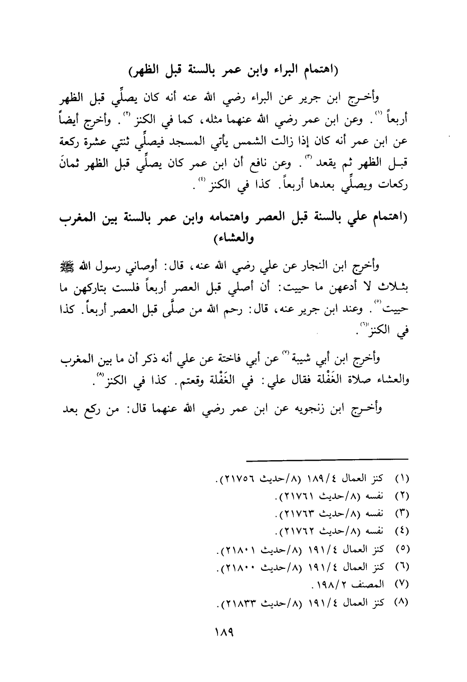 وأخرج ابن جرير عن البراء رضي الله عنه أنه كان يصلِّي قبل الظهر أربعاً. وعن ابن عرم رضي الله عنهما مثله. كما في الكنز وأخرج أيضاً عن ابن عمر أنه كان إذا زالت الشمس يأتي المسجد فيصلِّي ثنتي عشرة ركعة قبل الظهر ثم يقعد. وعن نافع أن ابن عمر كان يصلِّي قبل الظهر ثمانَ ركعات ويصلِّي بعدها أربعاً. كذا في الكنز.