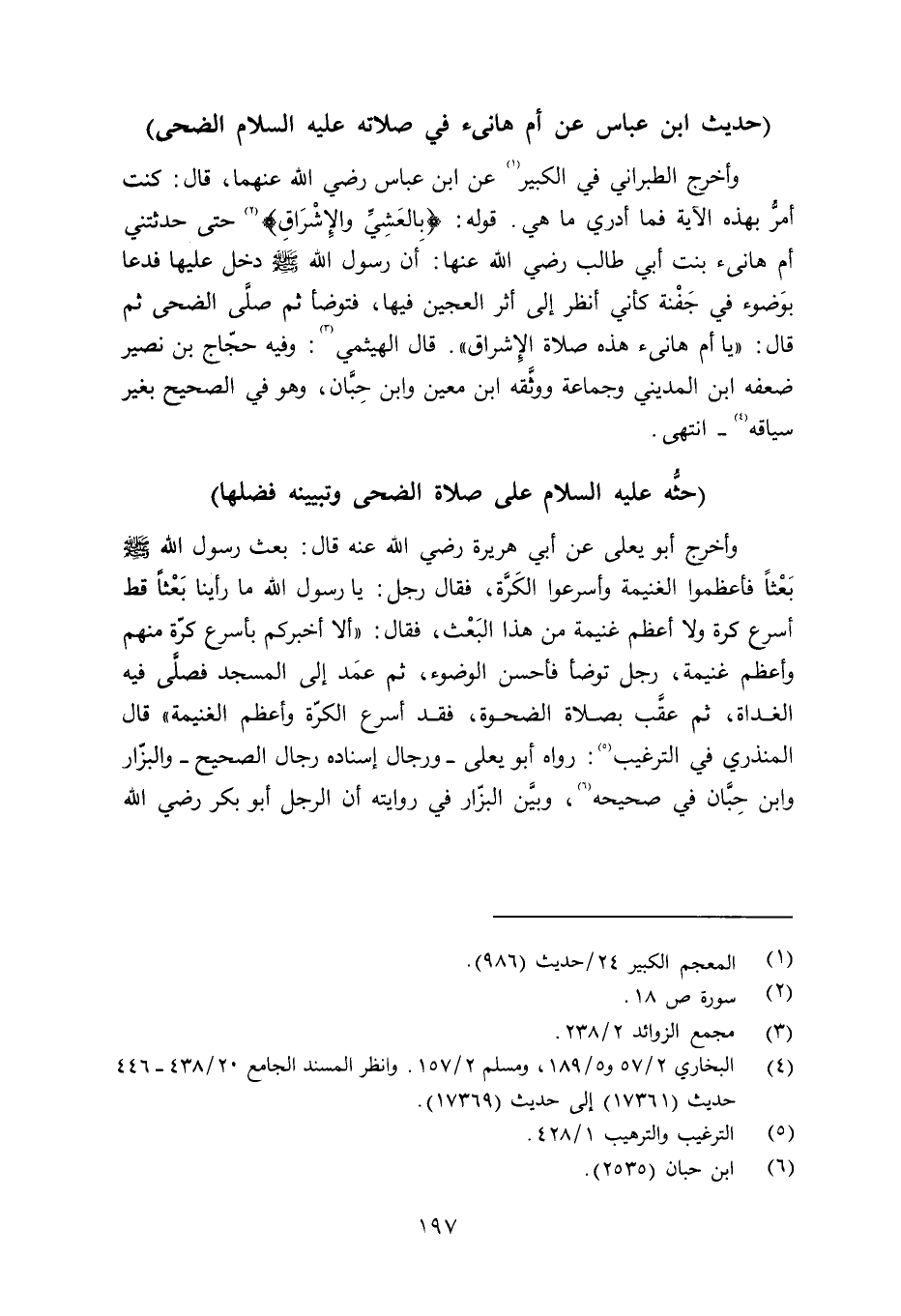 وأخرج الطبراني في الكبير عن ابن عباس رضي الله عنهما قال: كنت أمرُّ بهذه الآية فما أدري ما هي. قوله: {بِالْعَشِىّ وَالإشْرَاقِ} (سورة ص، الآية: 18) حتى حدثتني أم هانىء بنت أبي طالب رضي الله عنها: أن رسول الله صلى الله عليه وسلم دخل عليها فدعا بوَضوء في جَفْنة كأني أنظر إلى أثر العجين فيها، فتوضأ ثم صلَّى الضحى ثم قال: «يا أم هانىء هذه صلاة الإشراق» . قال الهيثمي: وفيه حجّاج ابن نصير ضعفه ابن المدين وجماعة ووثَّقه ابن معين وابن حِبّان وهو في الصحيح بغير سياقه - انتهى.