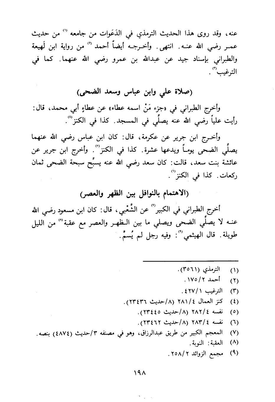 أخرج الطبراني في الكبير عن الشِّعْبي قال: كان ابن مسعود رضي الله عنه لا يصلِّي الضحى ويصلي ما بين الظهر والعصر مع عقبة من اليل طويلة. قال الهيثمي: وفيه رجل لم يُسمَّ.