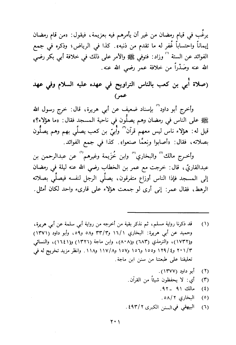 وأخرج أبو داود بإسناد ضعيف عن أبي هريرة قال: خرج رسول الله صلى الله عليه وسلم على الناس في رمضان وهم يصلُّون في ناحية المسجد فقال: «ما هؤلاء» ؟ قيل له: هؤلاء ناس ليس معهم قرآن وأُبيّ بنكعب يصلِّي يهم وهم يصلُّون بصلاته، فقال: «أصابوا ونِعَّما صنعوا» . كذا في جمع الفوائد. وأخرج مالك والبخاري وابن خُزيْمة وغيرهم عن عبد الرحمن بن عبد القاريّ قال: خرجت مع عمر بنا لخطاب رضي الله عنه ليلة في رمضان إلى املسجد فإذا الناس أوزاع متفرقون، يصلِّي الرجل لنفسه فيصلِّي بصلاته الرهط، فقال عمر: إني أرى لو جمعت هؤلاء على قارىء واحد لكان أمثل،